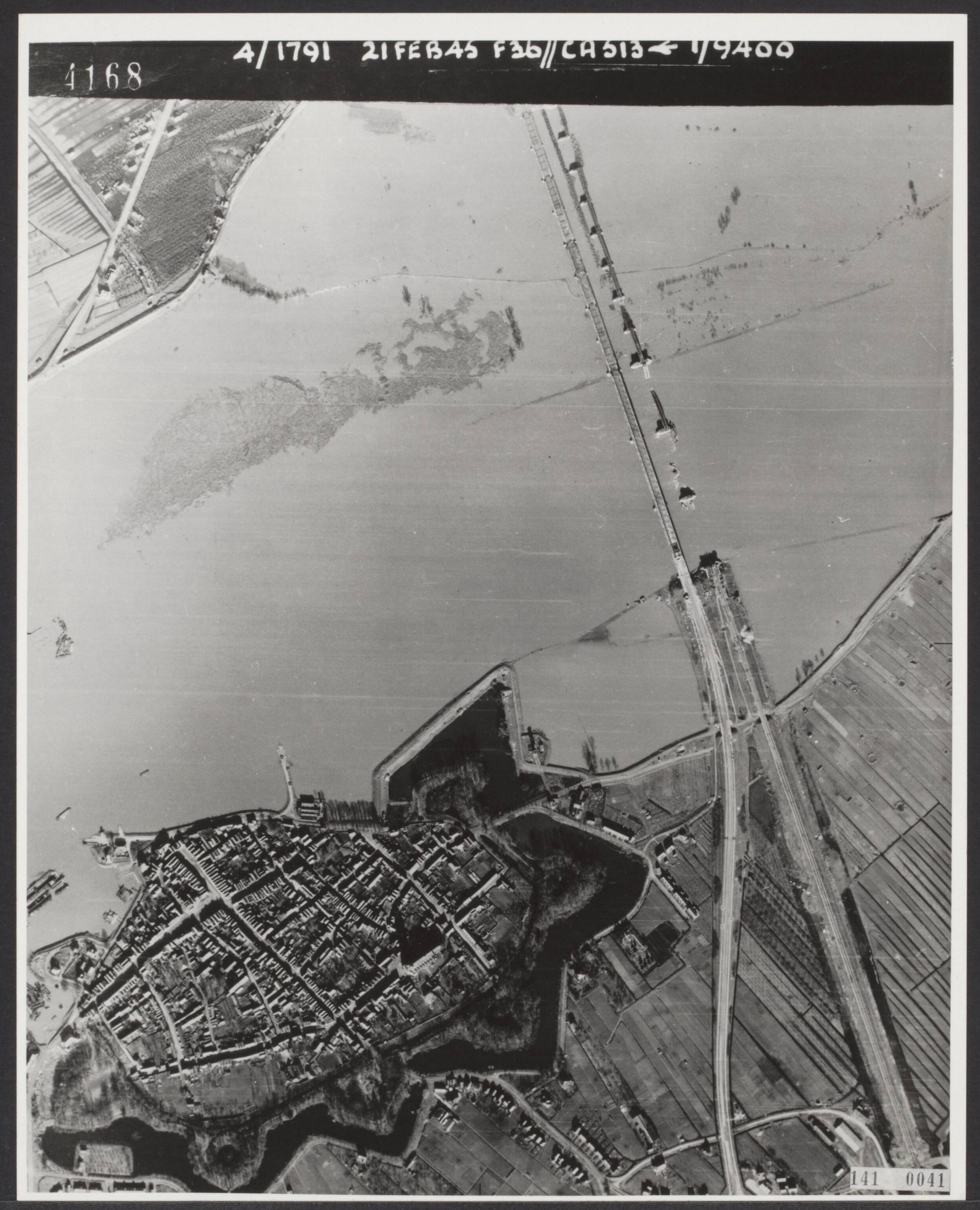 Luchtopname. De bruggen bij Zaltbommel. De spoorbrug is op 29 oktober 1944 door de Duitsers gesprongen