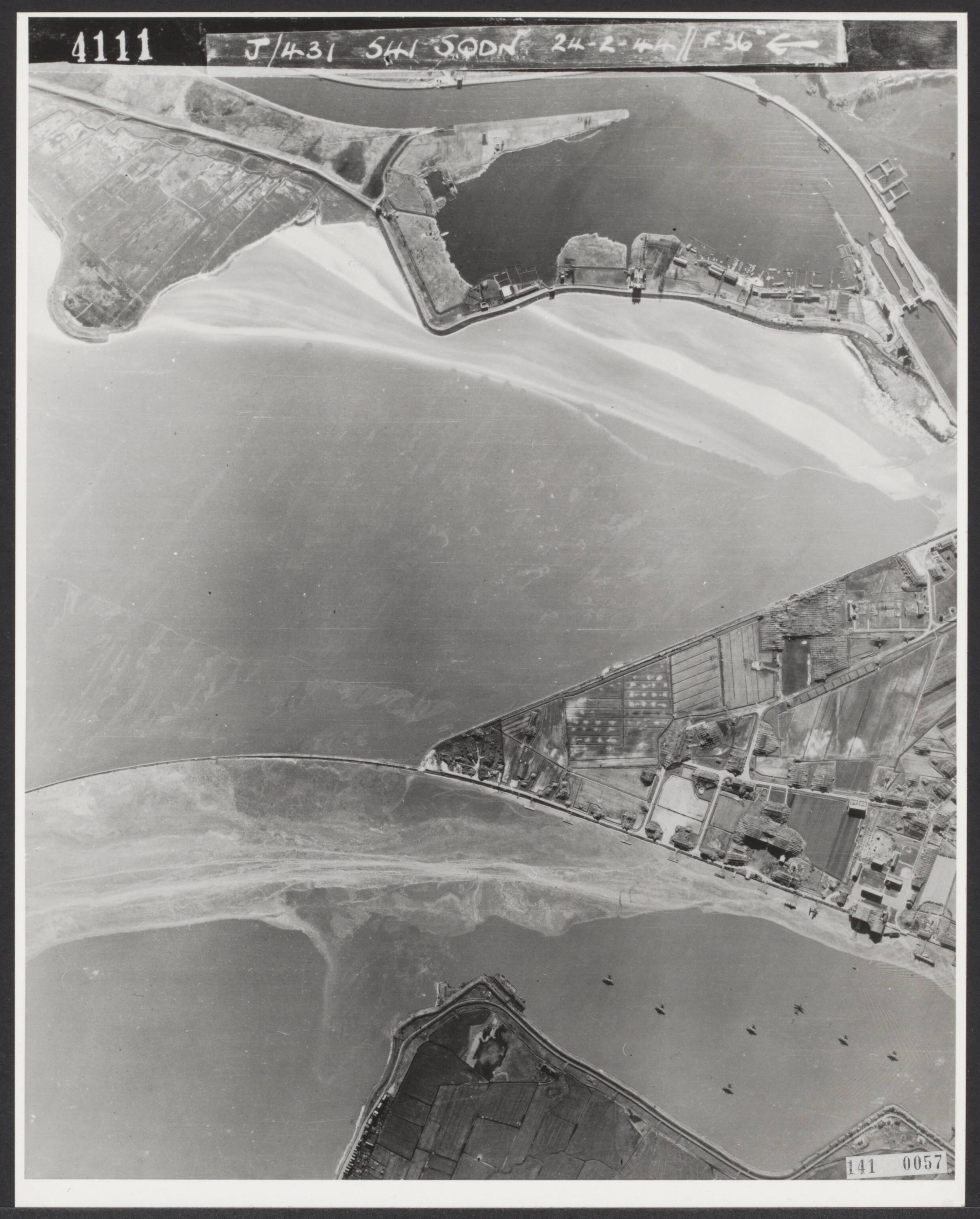 Luchtopname. Schellingwoude bij Amsterdam. Voor 1940 marinehaven voor watervliegtuigen. Tijdens de bezetting steunpunt voor watervliegtuigen van de Duitse Kriegsmarine. Het in de IJmond gelegen eilandje is tot 1945 als een kleine gecamoufleerde vesting ingericht. De vliegtuigen liggen voor de veiligheid met ruime onderlinge afstand in het IJ