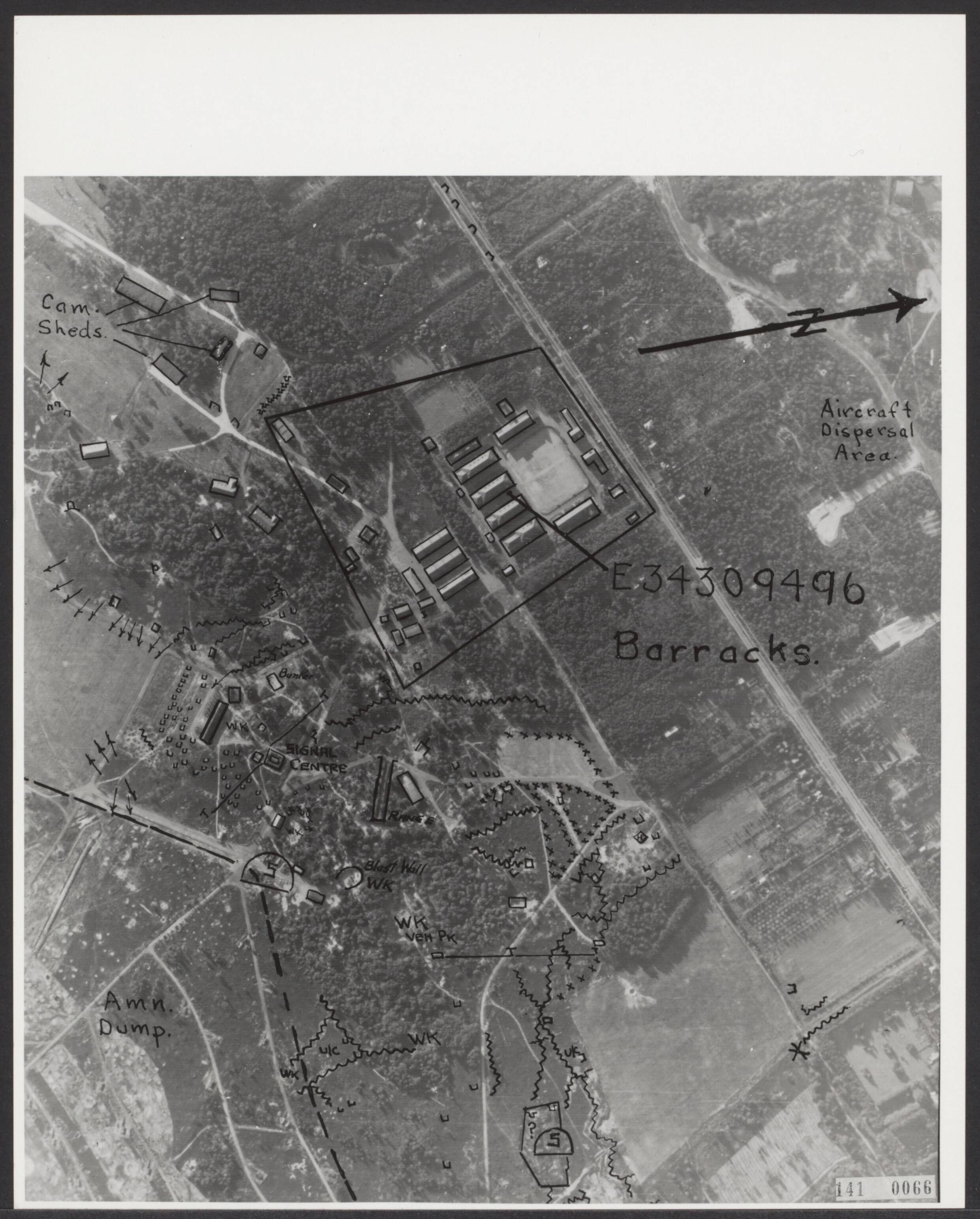 Luchtopname. Geïnterpreteerde foto van een deel van het vliegveld Soesterberg. Met inkt zijn allerlei details zoals gebouwen, geschutsopstellingen, loopgraven en versperringen aangegeven