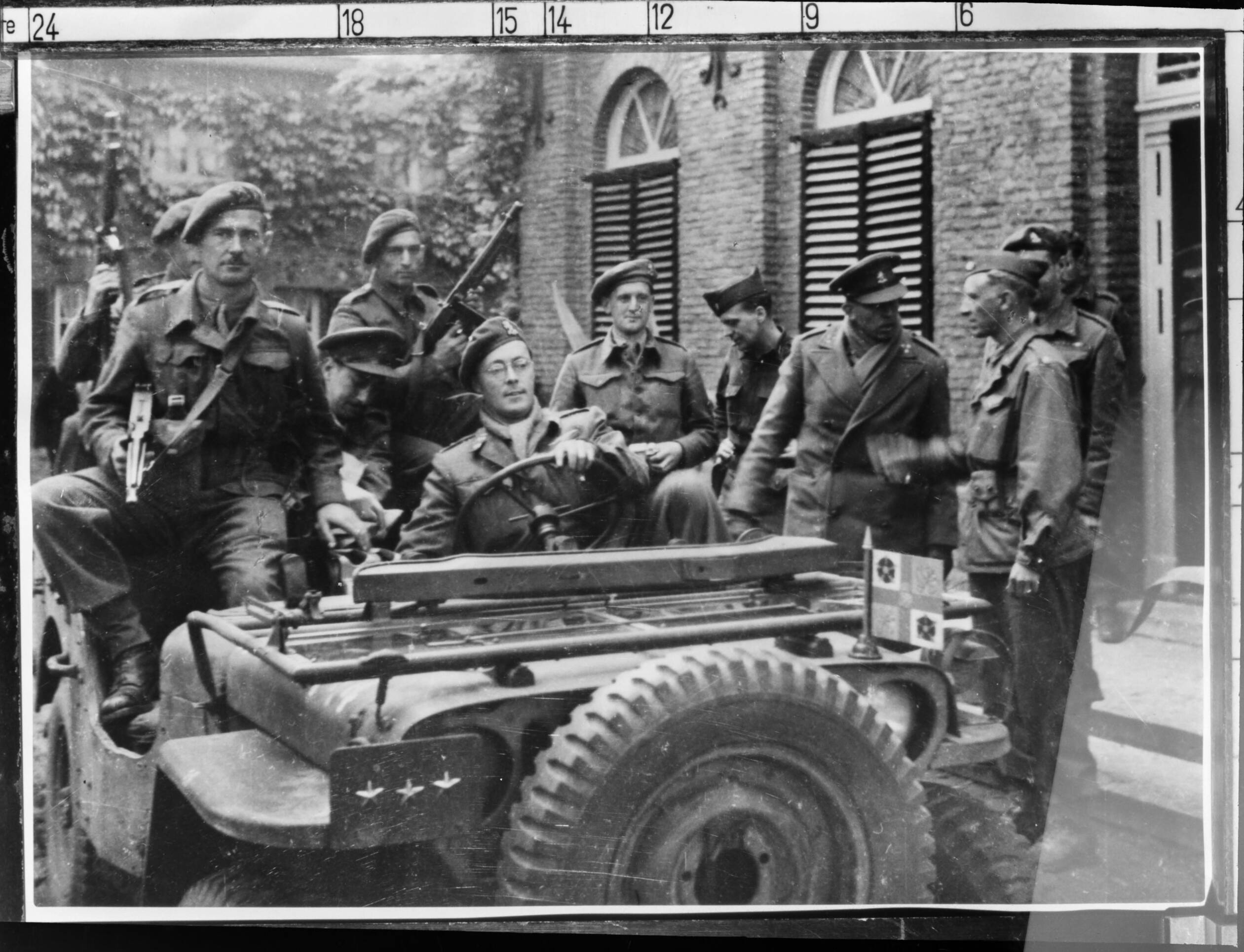 Foto van prins Bernhard in een jeep omringd door officieren waarschijnlijk in Nijmegen