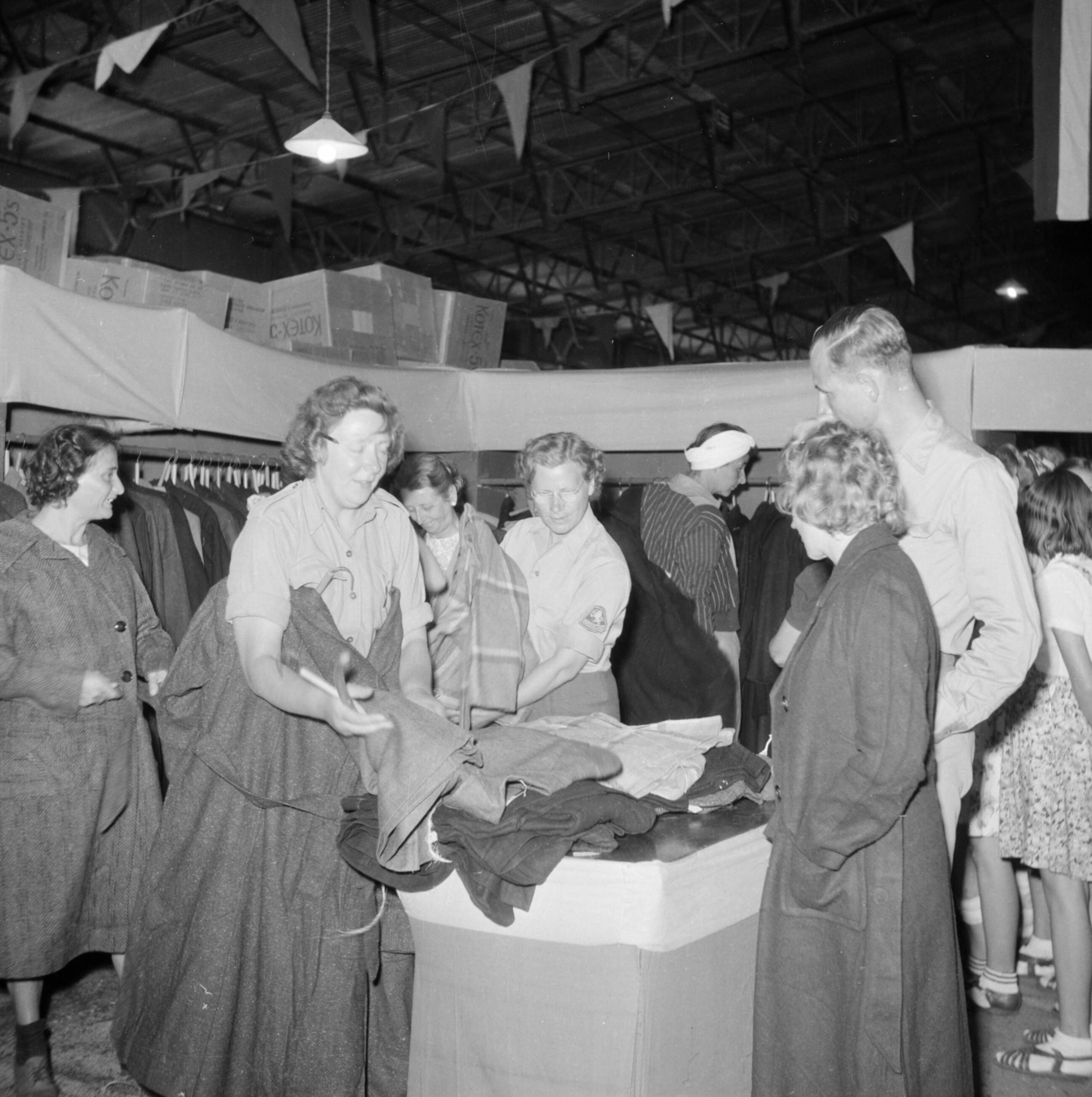 Nederlandse repatrianten krijgen kleding uitgereikt in het kledingcentrum in Ataka (Egypte)