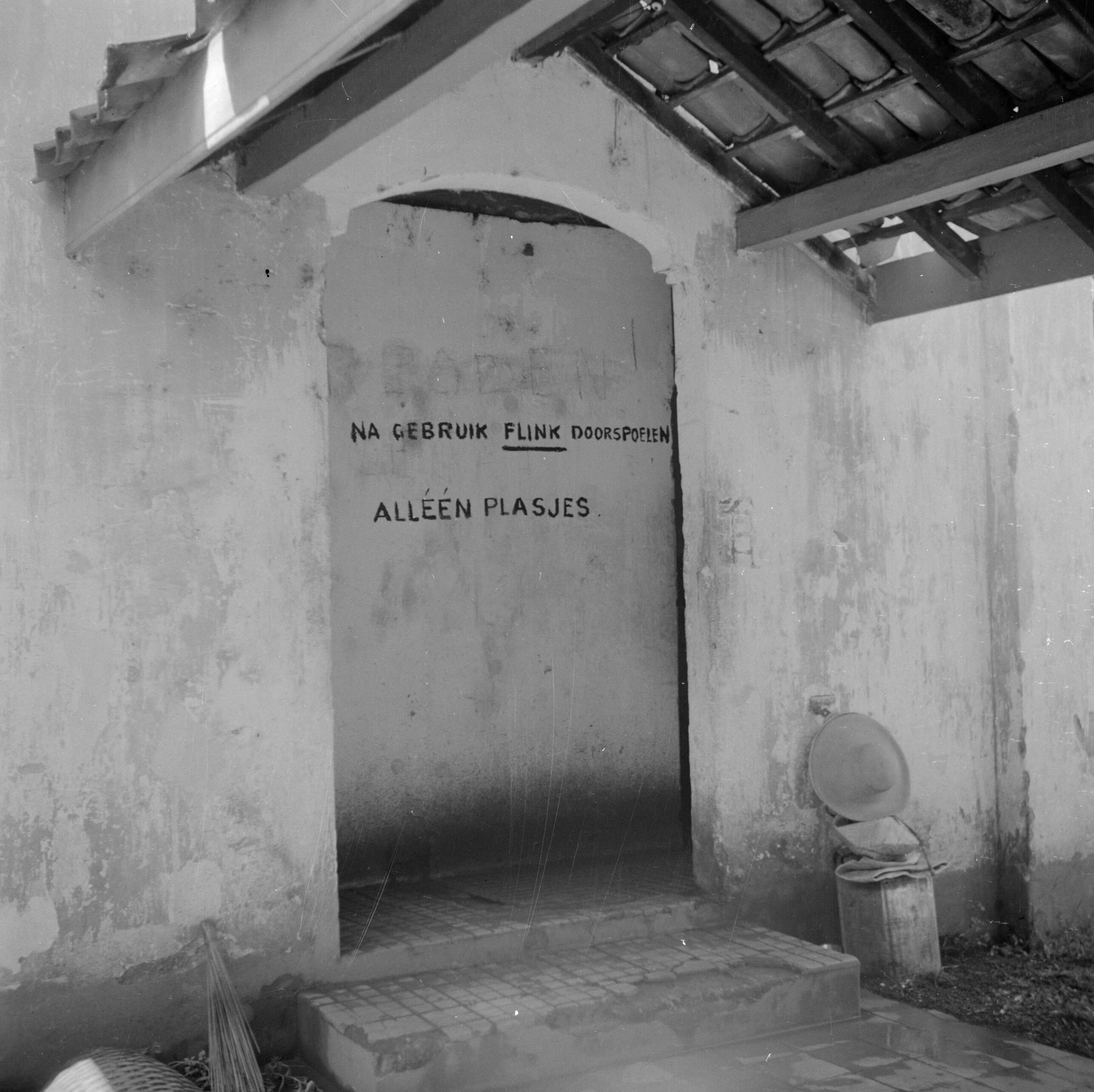 Deurgat in het Adek-kamp en een muur met het opschrift: Na gebruik flink doorspoelen. Alléén plasjes