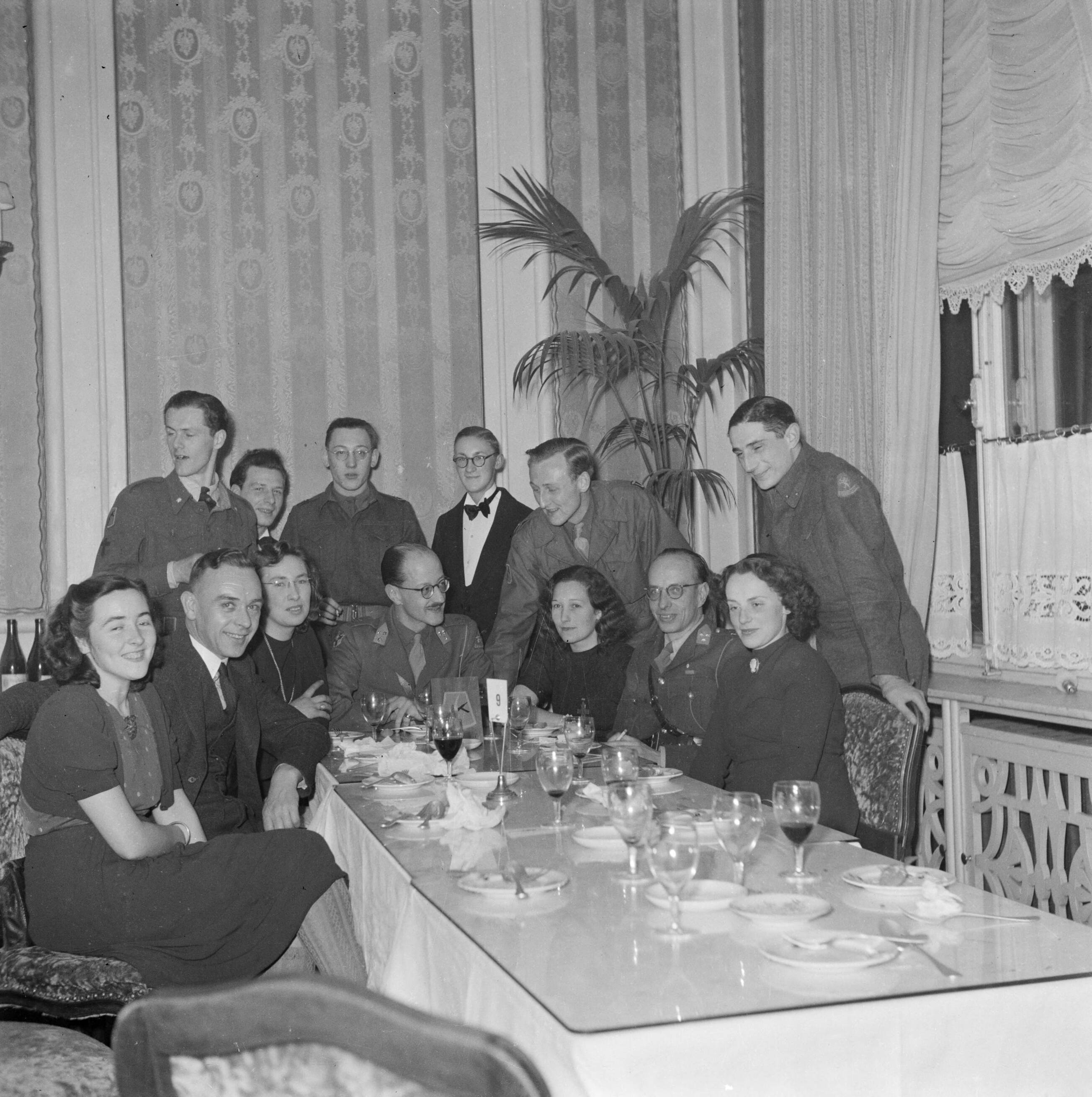 Kapitein Gerrie van Maasdijk, lid van de staf van prins Bernhard, aan het hoofd van een tafel, met gezelschap