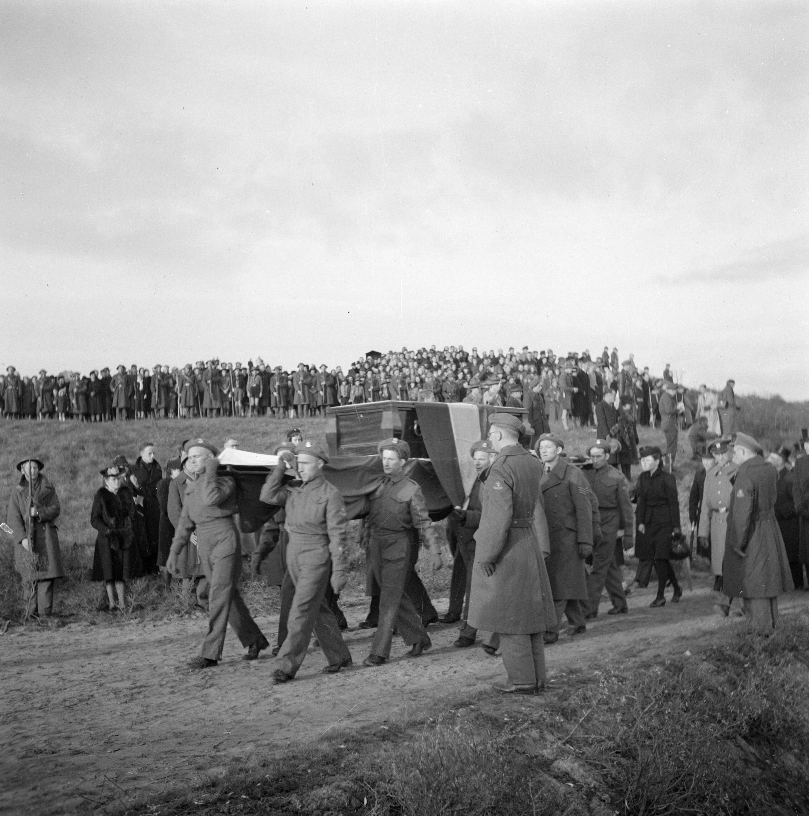 Een kist wordt door militairen naar de Erebegraafplaats Bloemendaal in Overveen gedragen