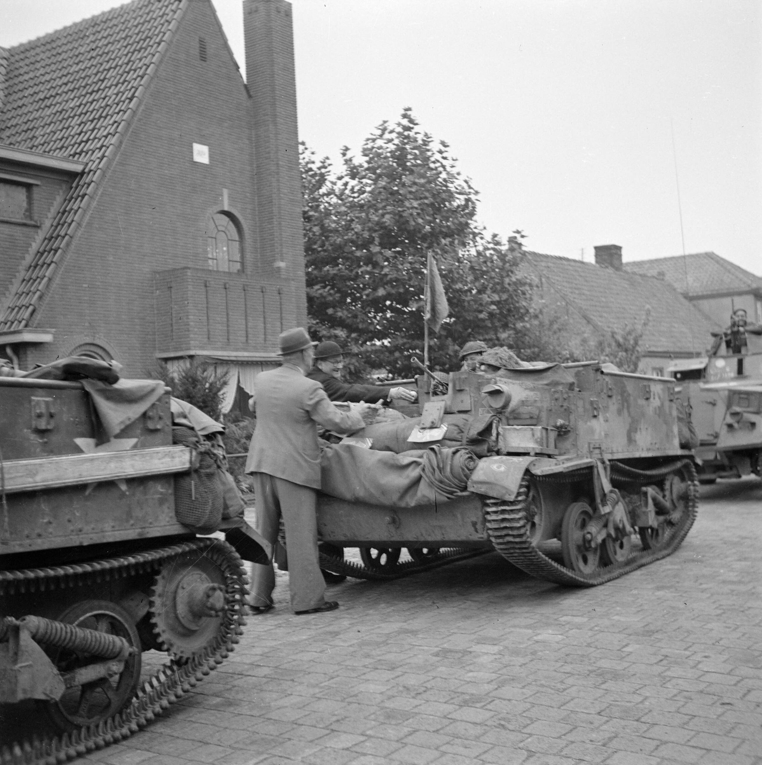 Burgers en pastoor delen bij de bevrijding fruit uit aan militairen in pantservoertuig, vermoedelijk militairen van de Irish Guard...