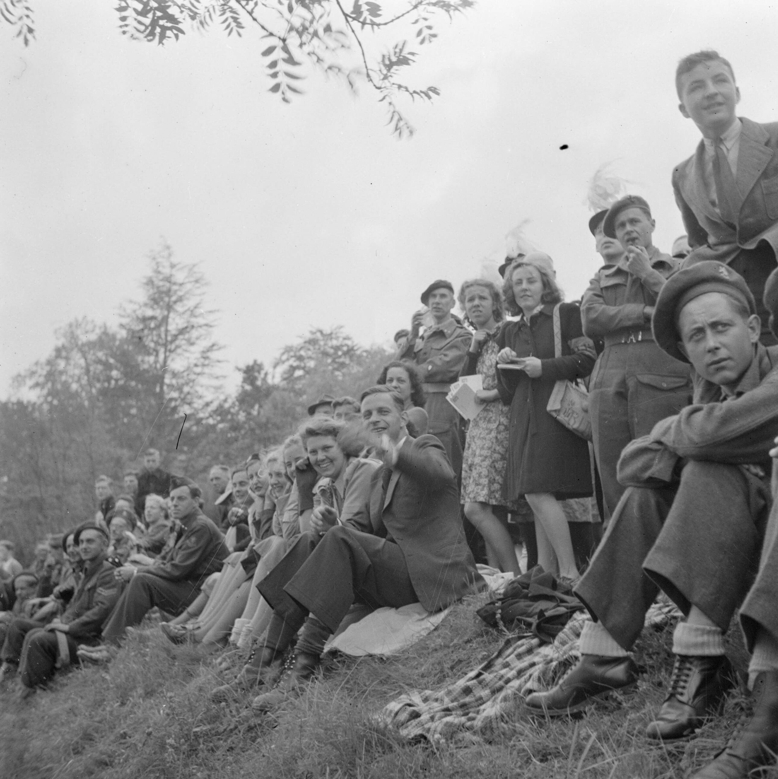 Een militaire oefening. Een rivier moet worden overgestoken. Publiek langs de oever