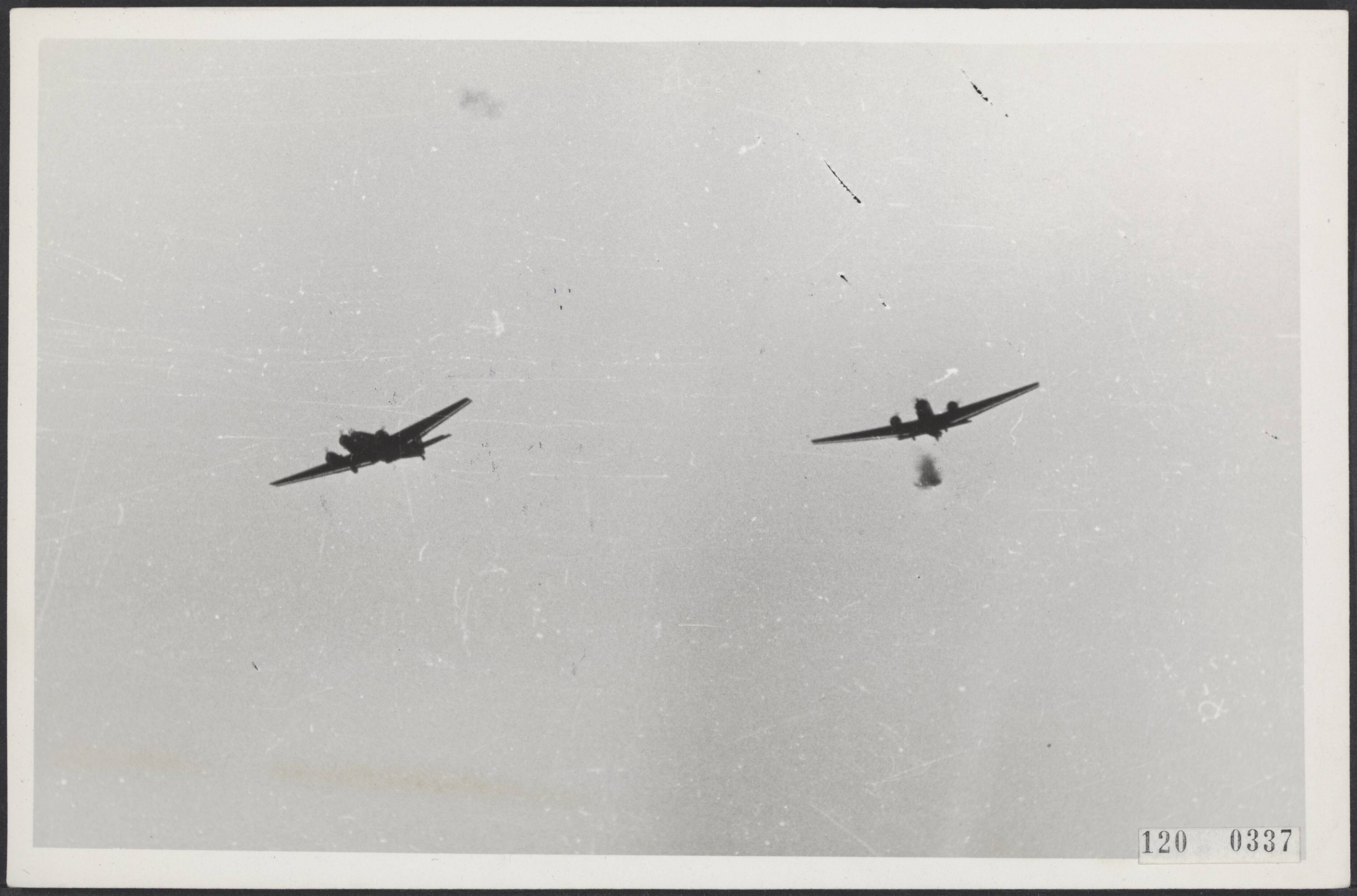 Meidagen 1940. Duits vliegtuig wordt aangeschoten door luchtdoelgeschut