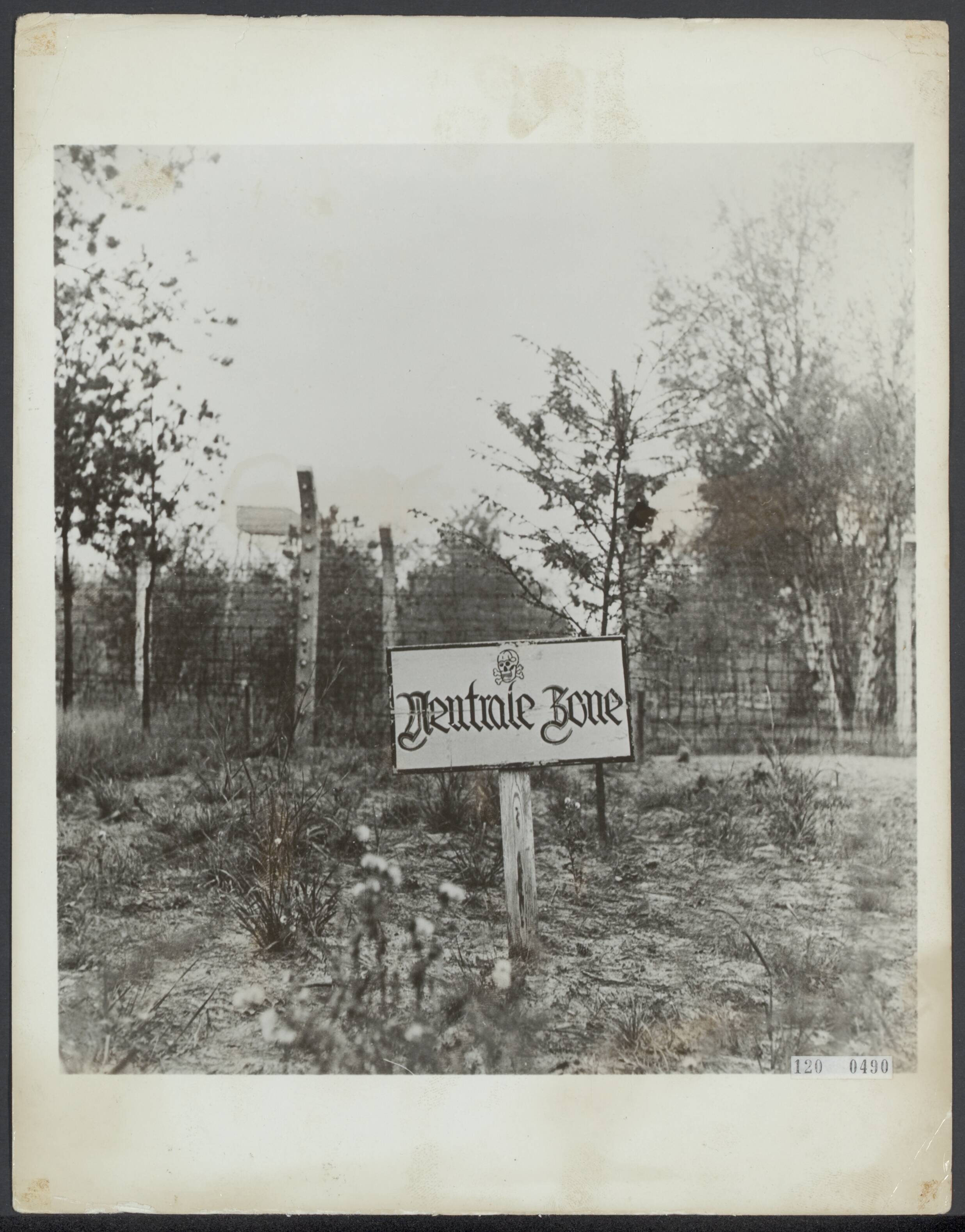 Concentratiekamp te Vught. Bord met mededeling "Neutrale Zone".