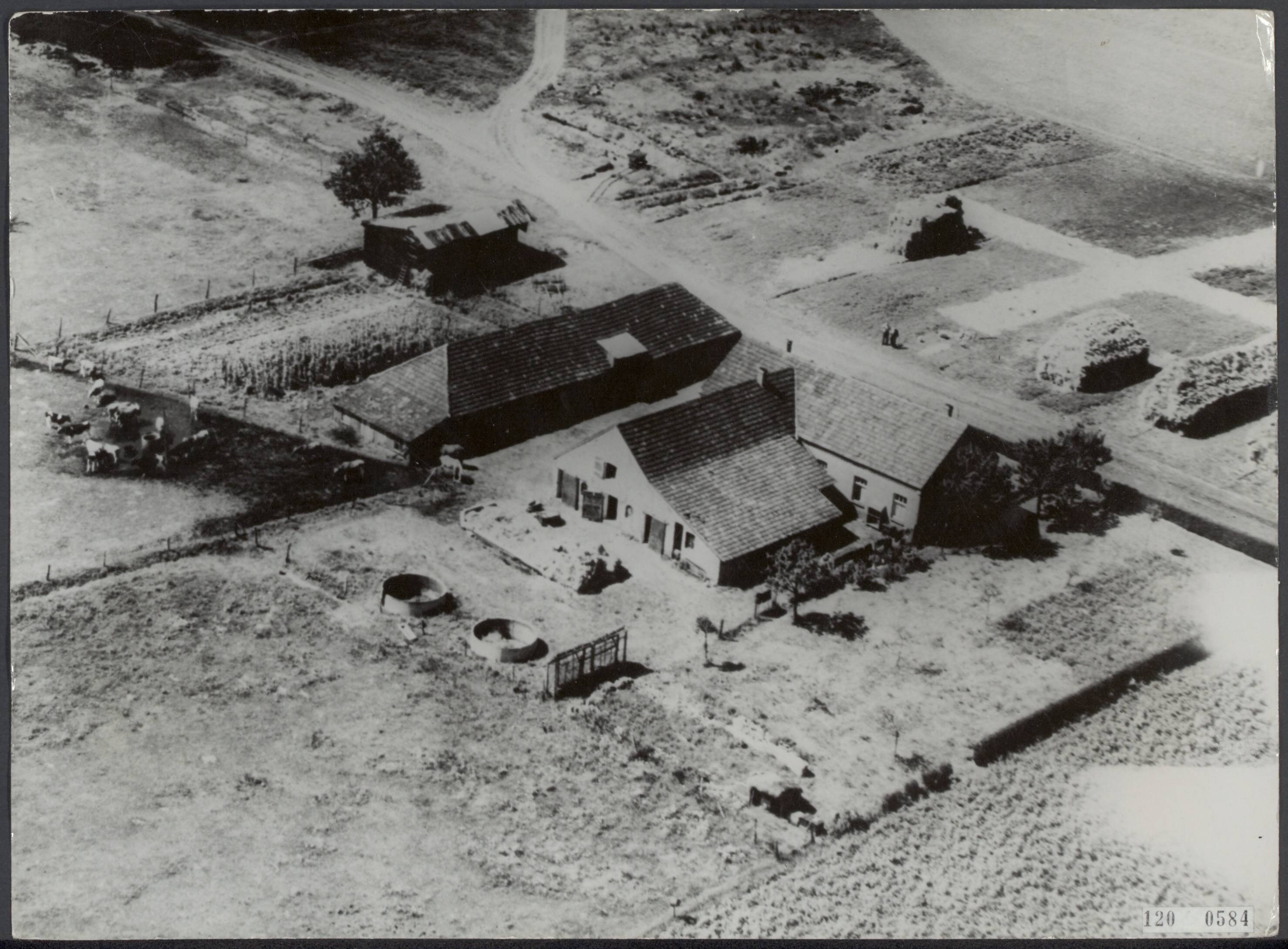 Luchtopname. De boerderij van de familie Poels waar meer dan 300 Amerikaanse en Britse piloten enige dagen verbleven bij hun terugkeer naar Engeland. De opname is gemaakt door een Amerikaans vliegtuig ter voorbereiding van het afwerpen van een krans als dank voor de getoonde moed. Het kruis op de grond geeft de plaats aan waar het oorspronkelijke, en door de Duitsers verwoeste, kruisbeeld heeft gestaan en waar nu een nieuwe is opgericht