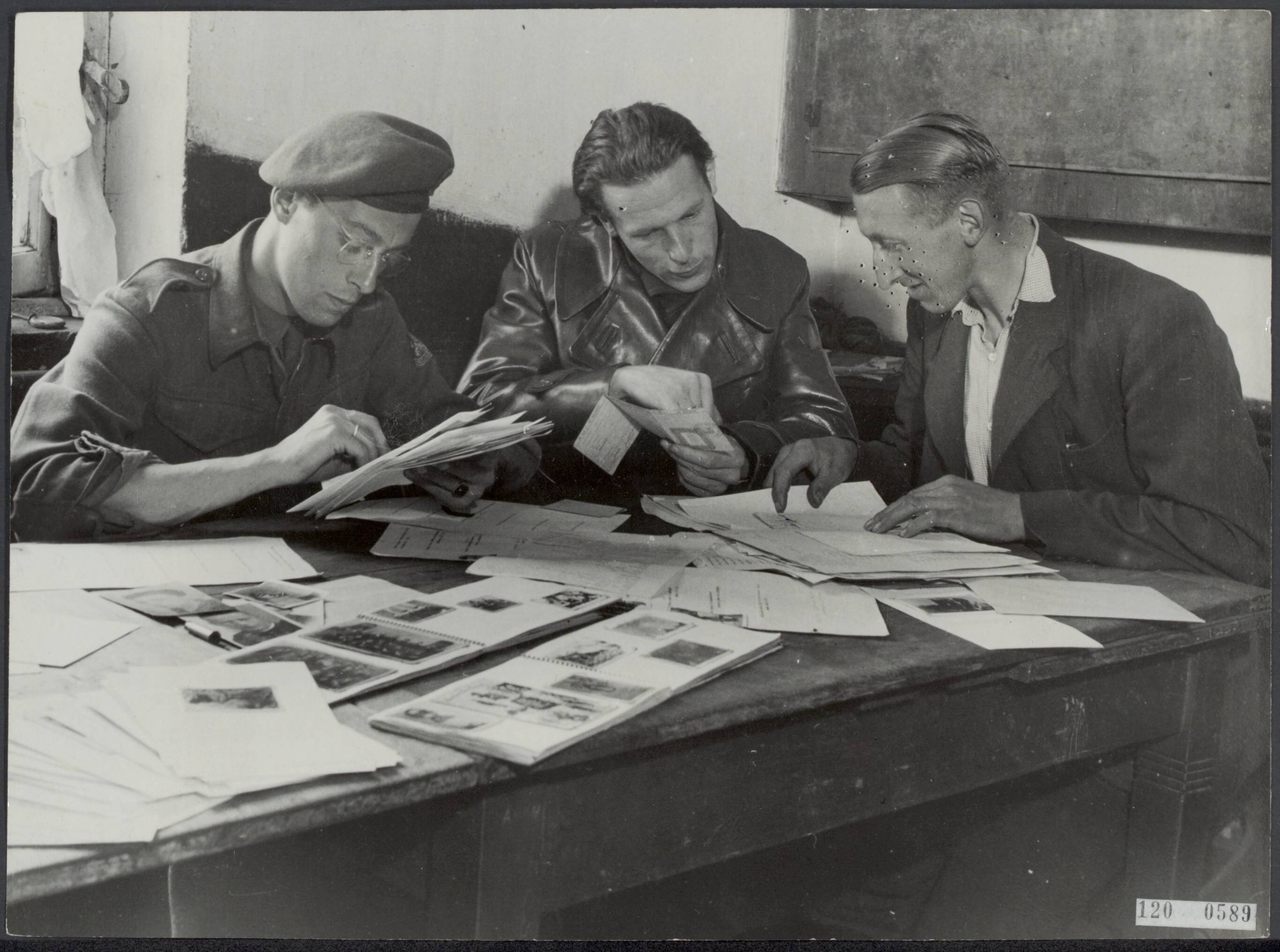 Bert Poels (rechts), de organisator van een groep die meer dan 300 vliegers uit handen van de Gestapo redde, in een kamer van zijn boerderij te America (Limburg). Hij legt de door de vliegers in te vullen lijsten uit en toont foto's van de mannen die via "De Zwarte Plak" passeerden op weg terug naar de geallieerde linies. 300 vliegers, 60 Franse krijgsgevangen, 30 joden en vele anderen die verborgen moesten worden voor de Gestapo is het record voor "De Zwarte Plak", naast ontelbare sabotage-acties die hier voorbereid werden. Er was zelfs een rechtbank voor verraders en Gestapo-agenten