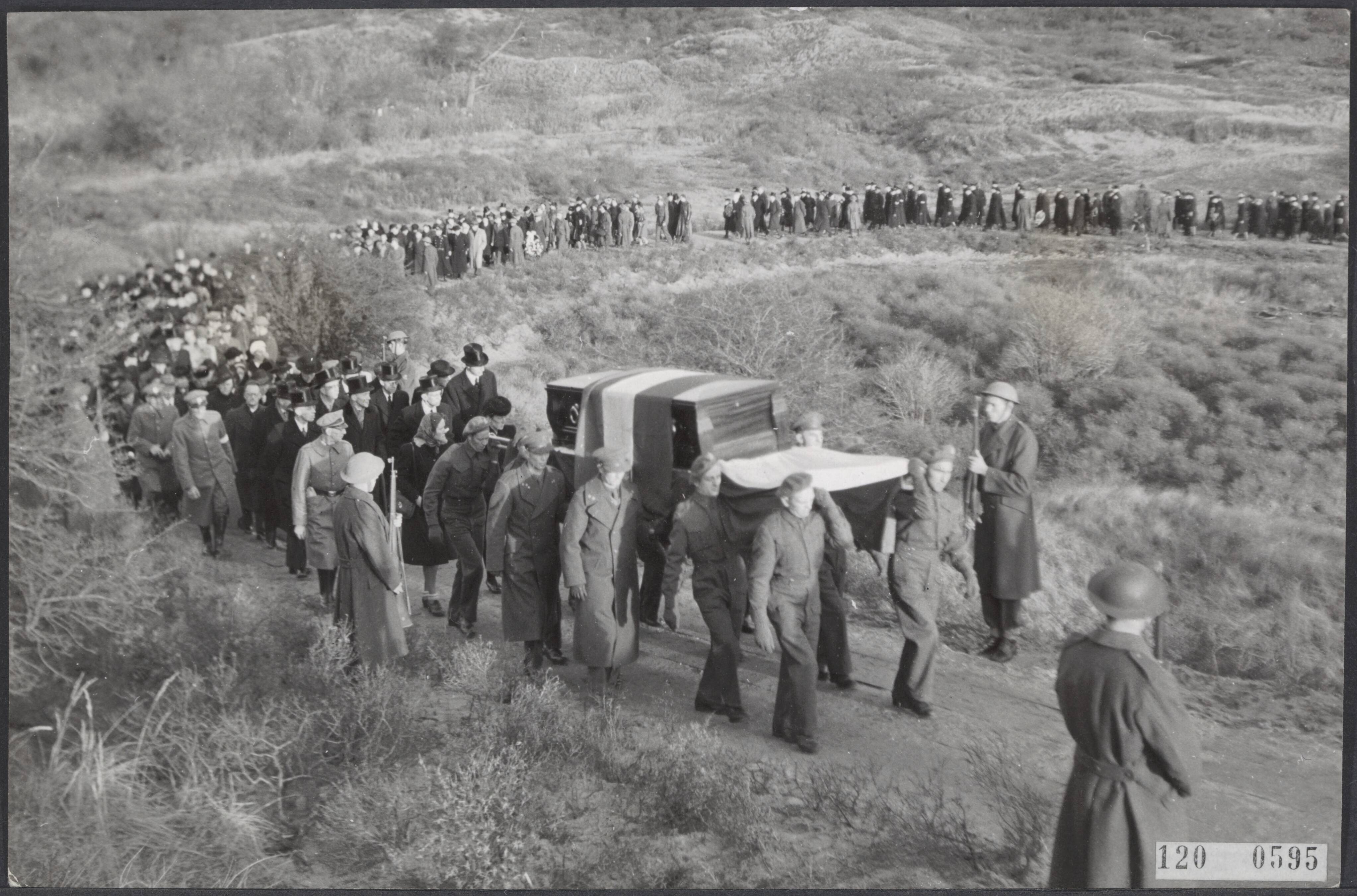 Een overzicht van de plechtige bijzetting van de stoffelijke resten van 400 illegale strijders op de begraafplaats aan de Zeeweg t...