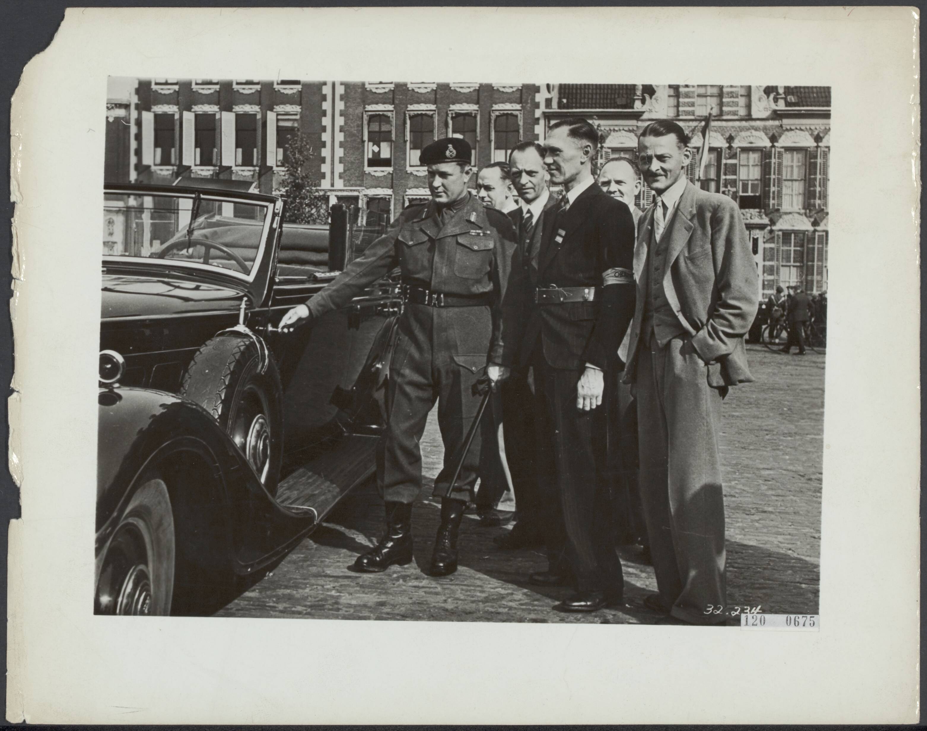 De dure auto die Anton Mussert van Hitler gekregen had is in Groningen op de Ossenmarkt teruggevonden door de ondergrondse en als teken van dankbaarheid getoond aan generaal-majoor B.M. Hoffmeister