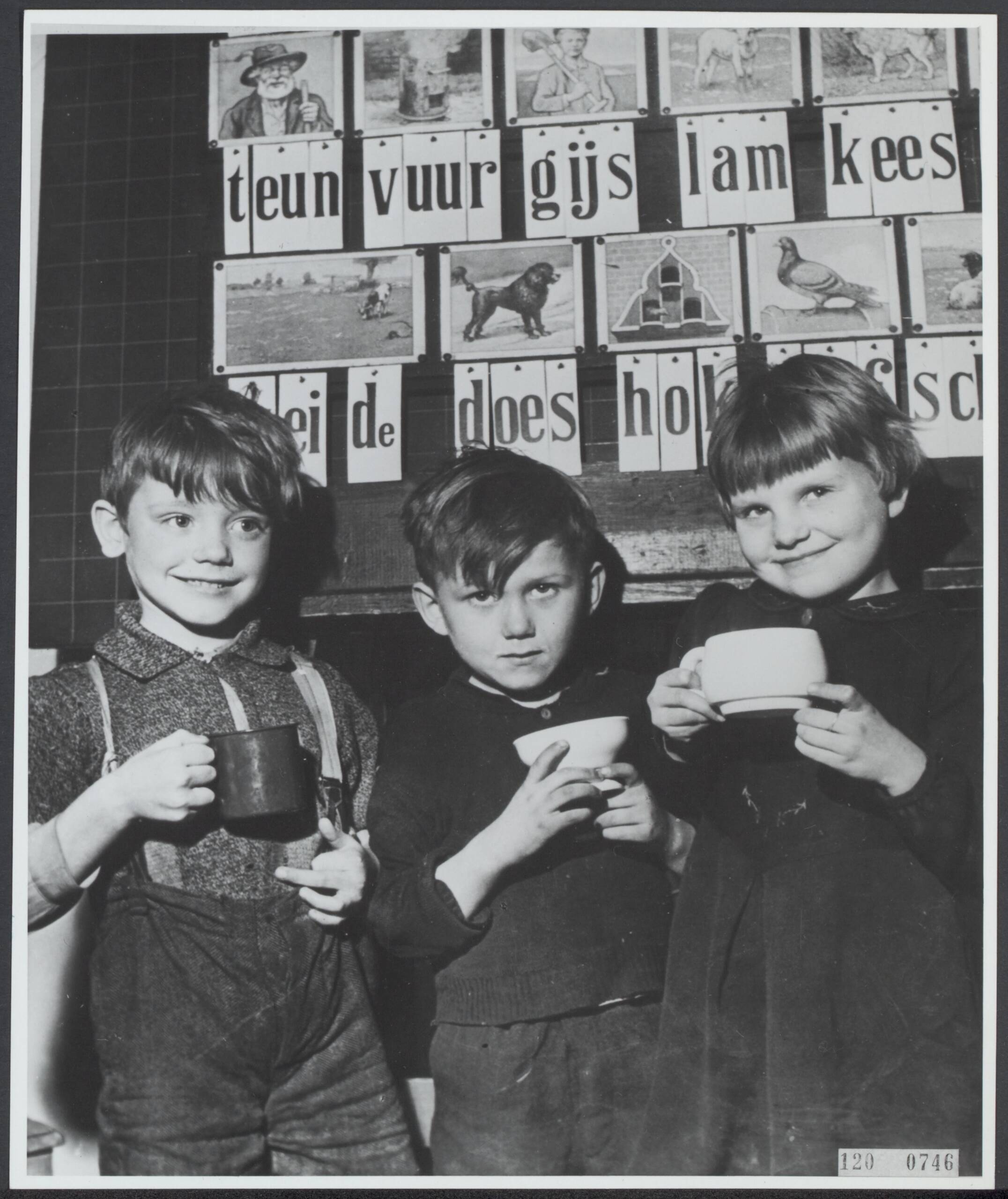 Hongerwinter. Rotterdam Kinderen op school krijgen dagelijks melk gemaakt van melkpoeder afkomstig van het Amerikaanse Rode Kruis. Dat helpt hun lichamelijk herstel na de hongerwinter.