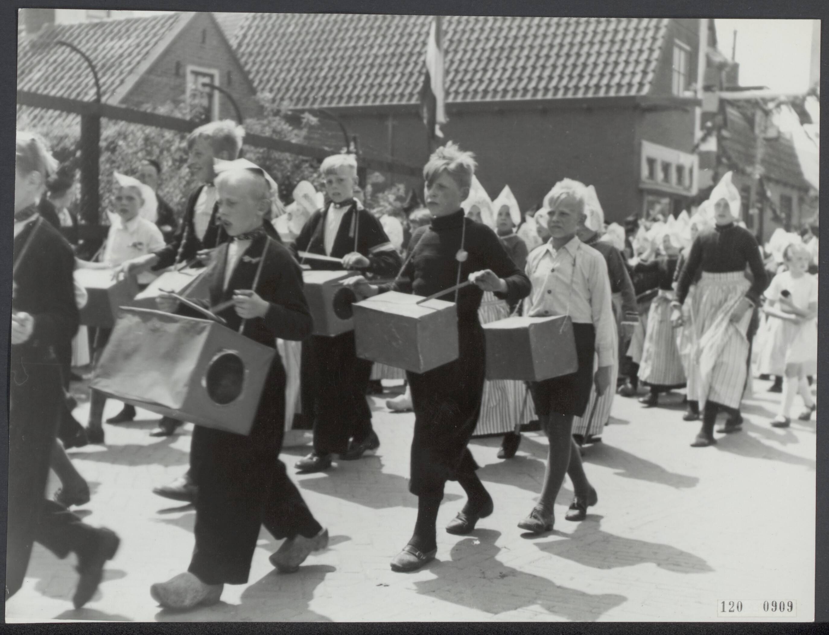 Bevrijdingsfeesten. Volendam viert feest. Engelse biscuitblikken dienen als trommels