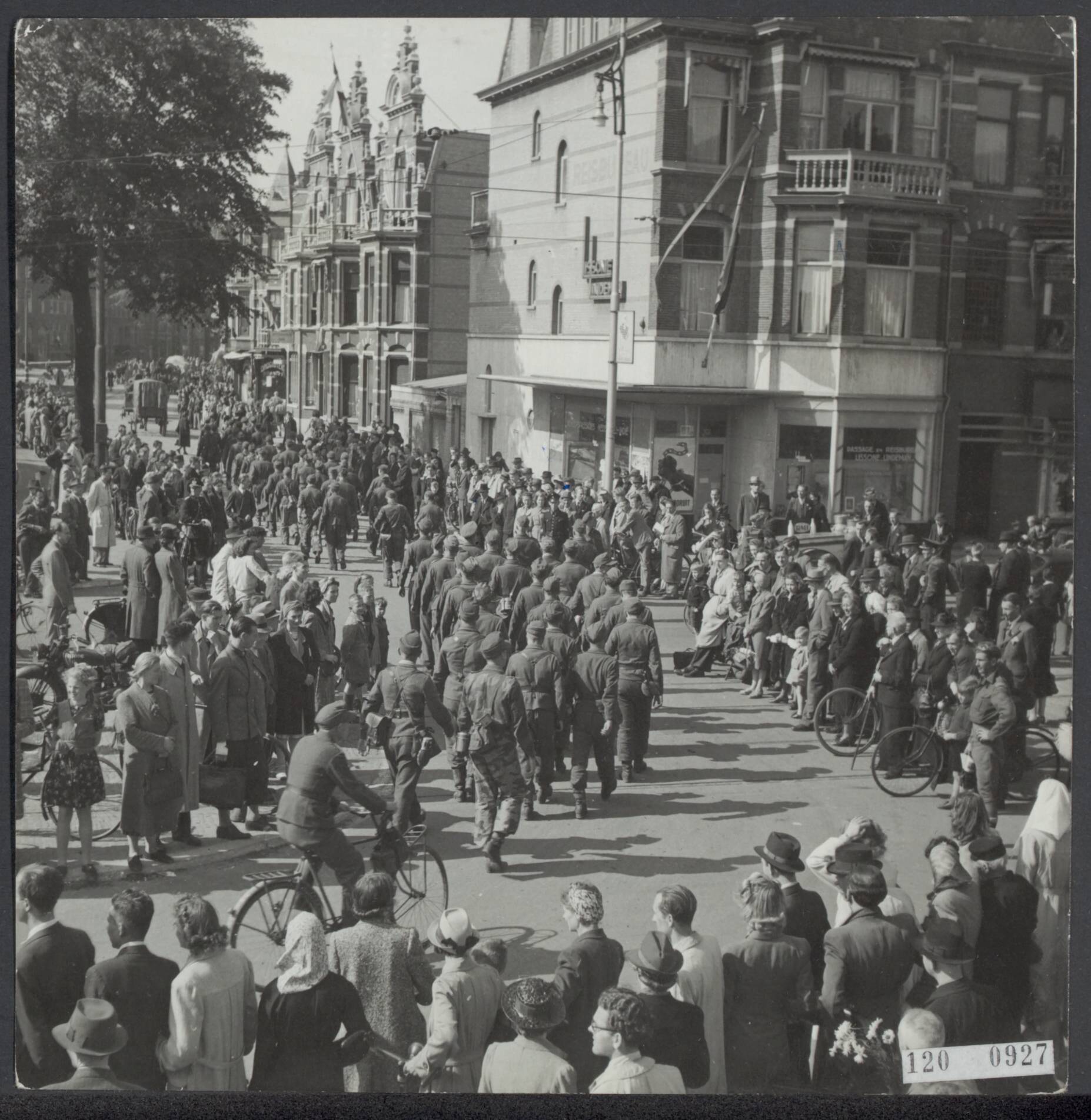 Den Haag. Duitse krijgsgevangenen worden afgevoerd