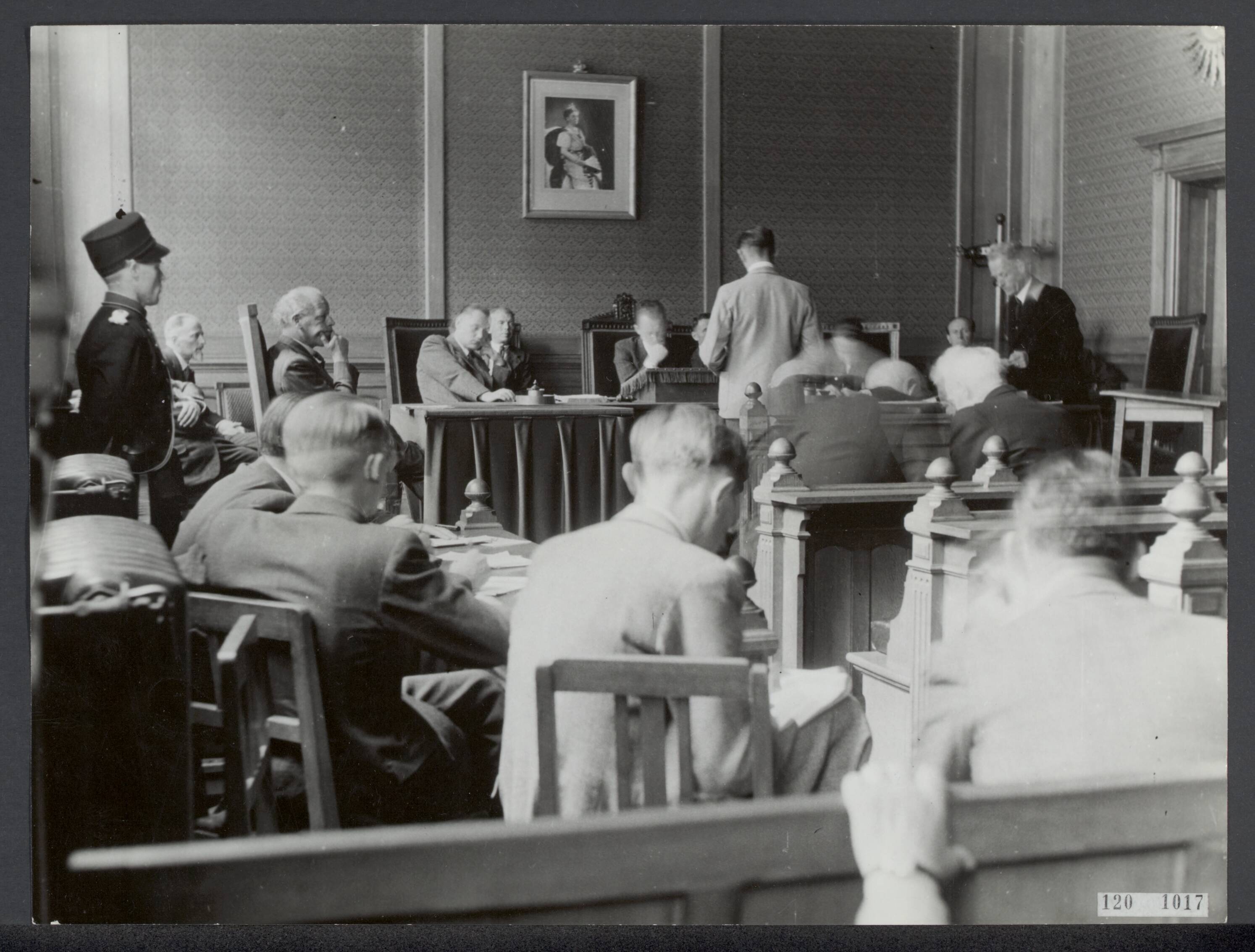 Eerste zitting Tribunaal Bijzondere Rechtspraak te Den Bosch. De beschuldigde staat voor de rechtbankpresident