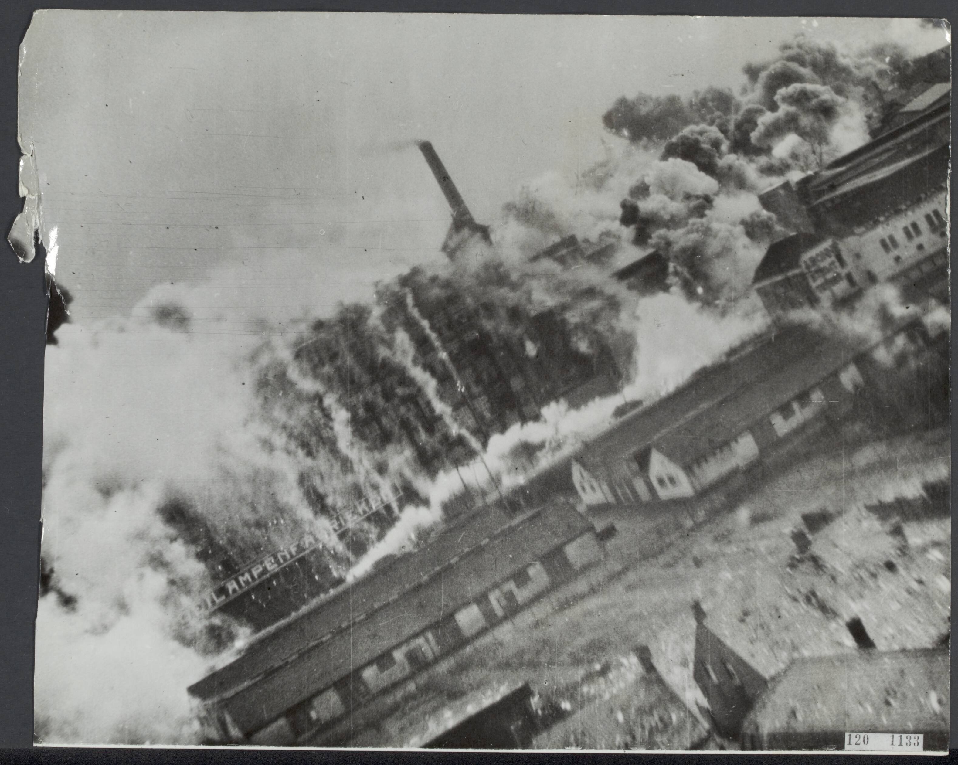 Britse RAF bommenwerpers bombarderen Philipsfabrieken in Eindhoven tijdens daglicht aanval.