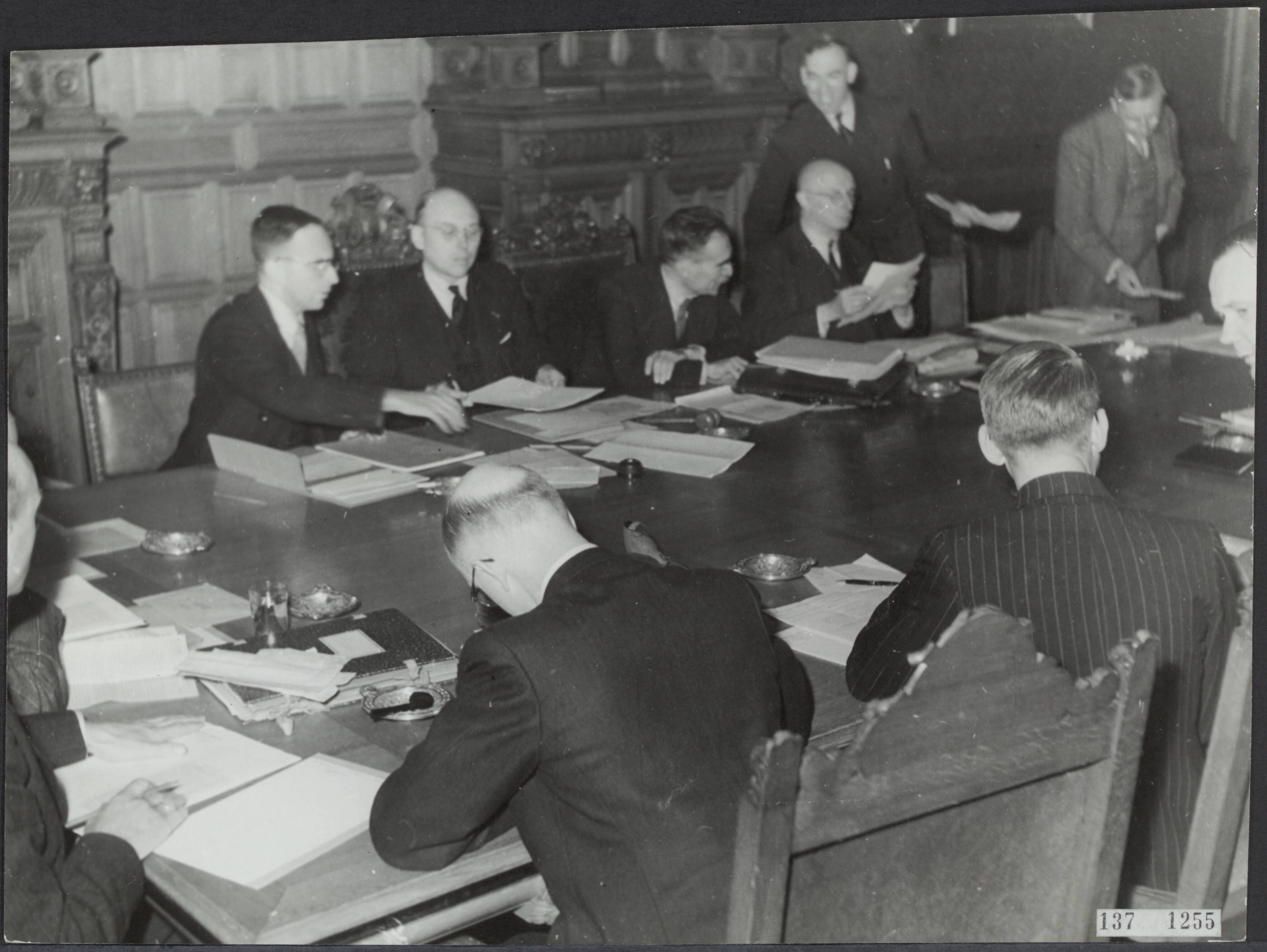 Kabinet Schermerhorn-Drees. Ministerraad in vergadering. Vlnr. secretaris van de ministerraad P.