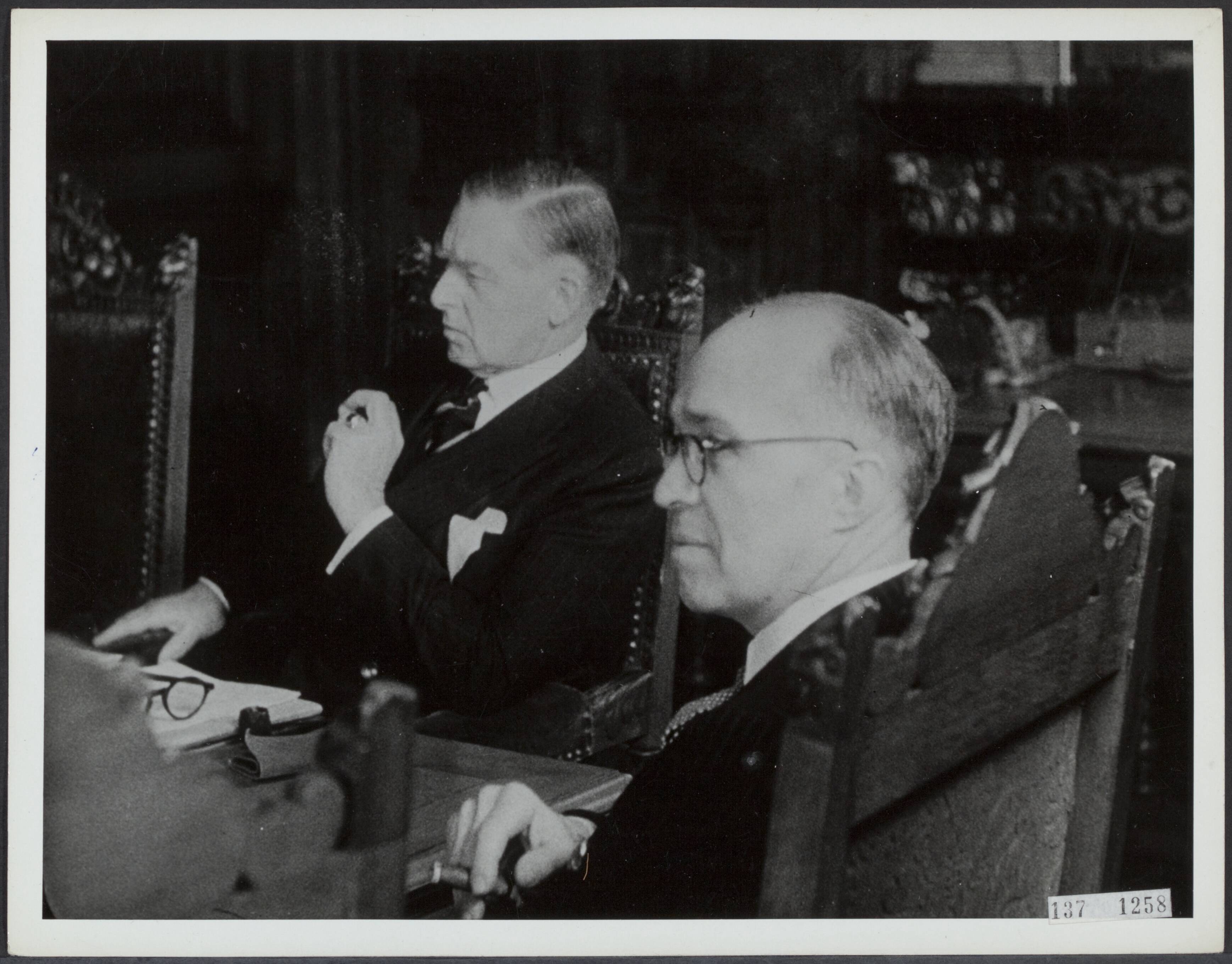 Kabinet Schermerhorn-Drees. Ministerraad. De ministers J.M. de Booy en J.H.A. Logemann