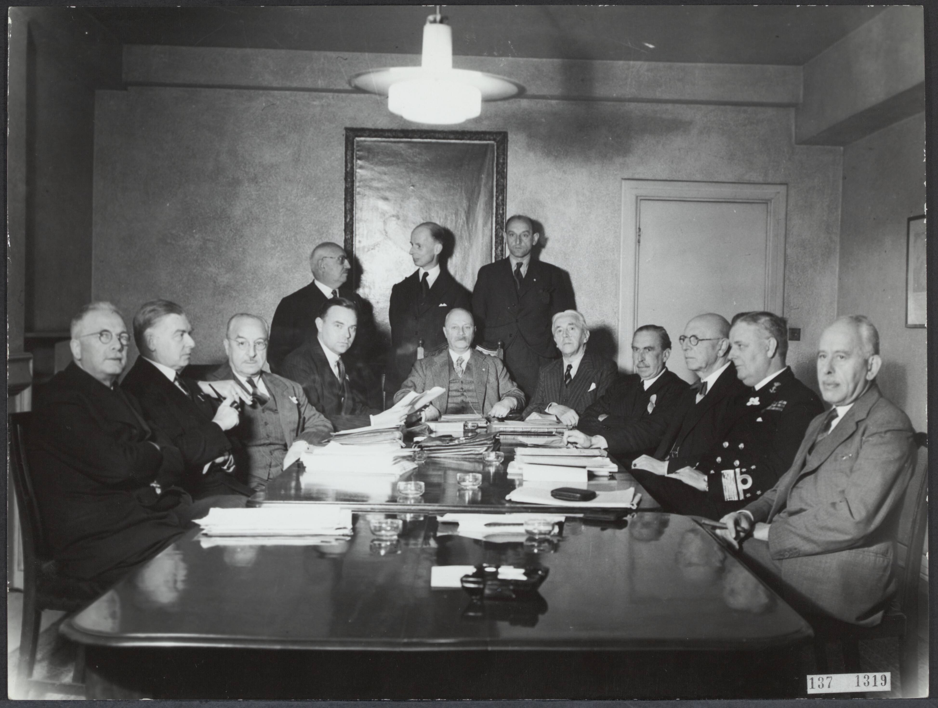 De ministerraad te Londen in de tweede helft van 1944. Staande vlnr. Van Lidth de Jeude, Van Kleffens, Van Heuven Goedhart. Zittend vlnr. Van den Tempel, De Booy, Van den Broek, Burger, Gerbrandy, Bolkestein, Michiels van Verduynen, Albarda, Furstner en Van Boeijen
