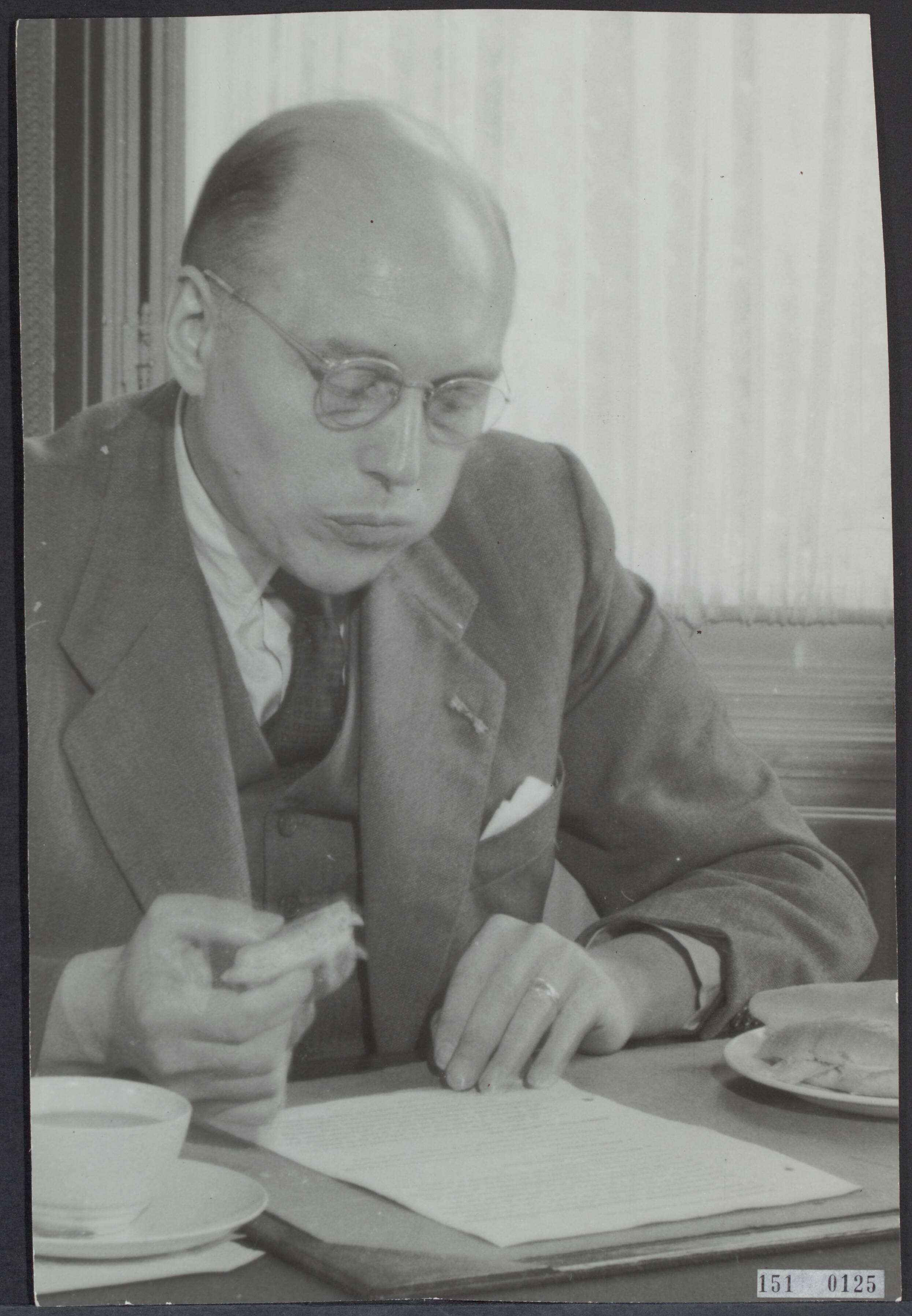 Minister-president Schermerhorn aan zijn bureau. Hij eet een broodje