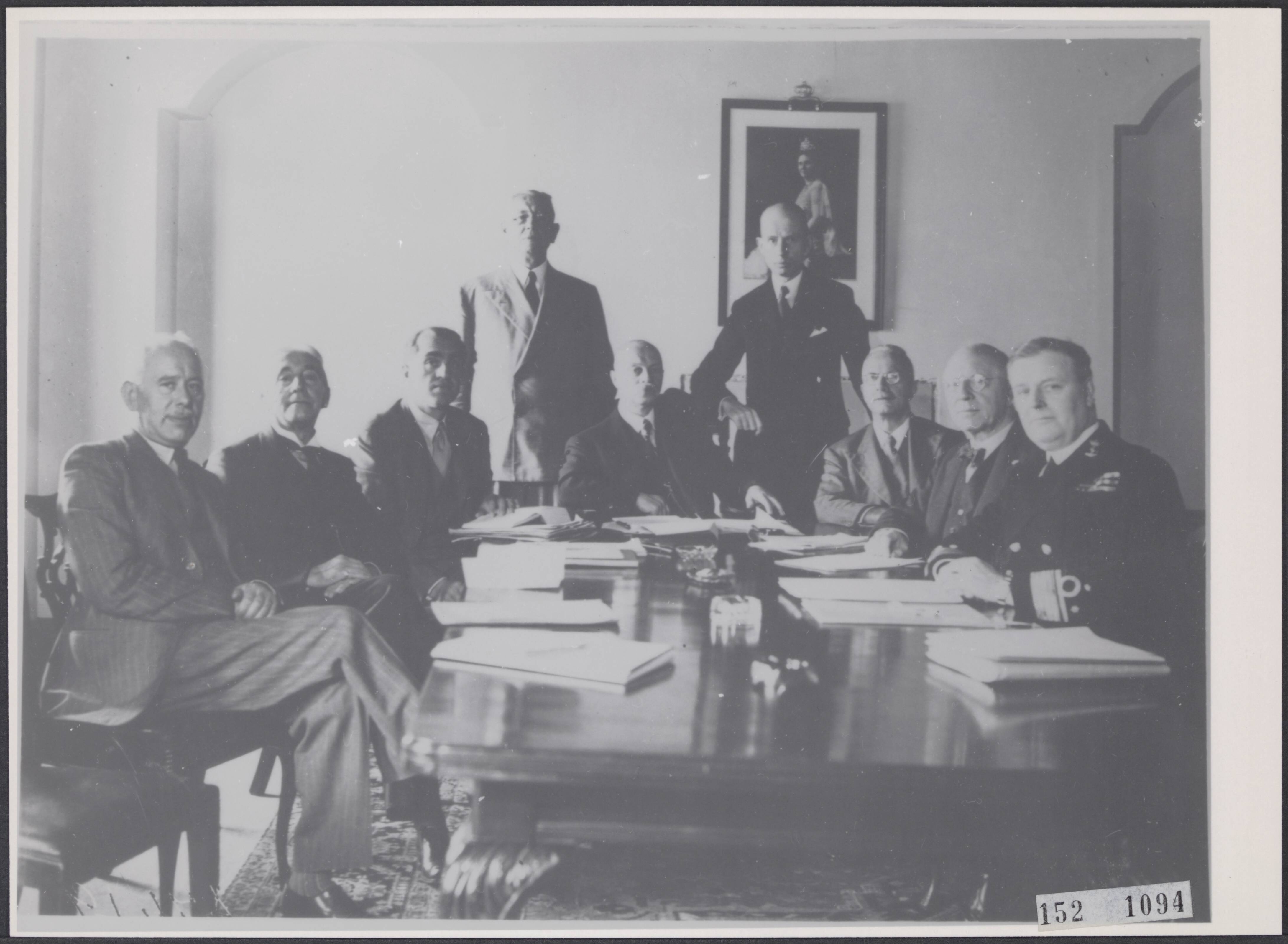 Ministerraad te Londen (kabinet Gerbrandy II, 1941-1945). Vlnr. H. van Boeijen (Algemene Zaken), G. Bolkestein (Ondewijs). M.P.L. Steenberghe (Handel), C.J. Welter (Koloniën), P.S. Gerbrandy (Algemene Oorlogsvoering), E.N. van Kleffens (Buitenlandse Zaken), J. van den Tempel (Sociale Zaken), J.W. Albarda (Waterstaat), J.T. Furstner (Marine)