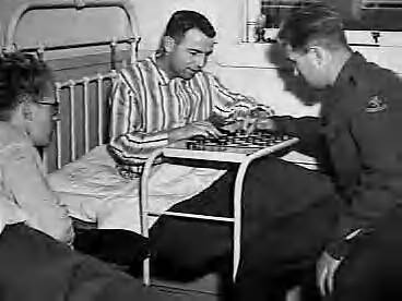 Nederlandse recruten uit Europa van het KNIL in training op Camp Darley, Victoria (Australië). Soldaat W. H. de Bruyn (links) bekijkt een partij dammen gespeeld door soldaat M. Tonen, uit Gelderland (midden), en soldaat J. Koolen (uit Noord-Brabant) in de Nederlandse afdeling van het ziekenhuis van het kamp