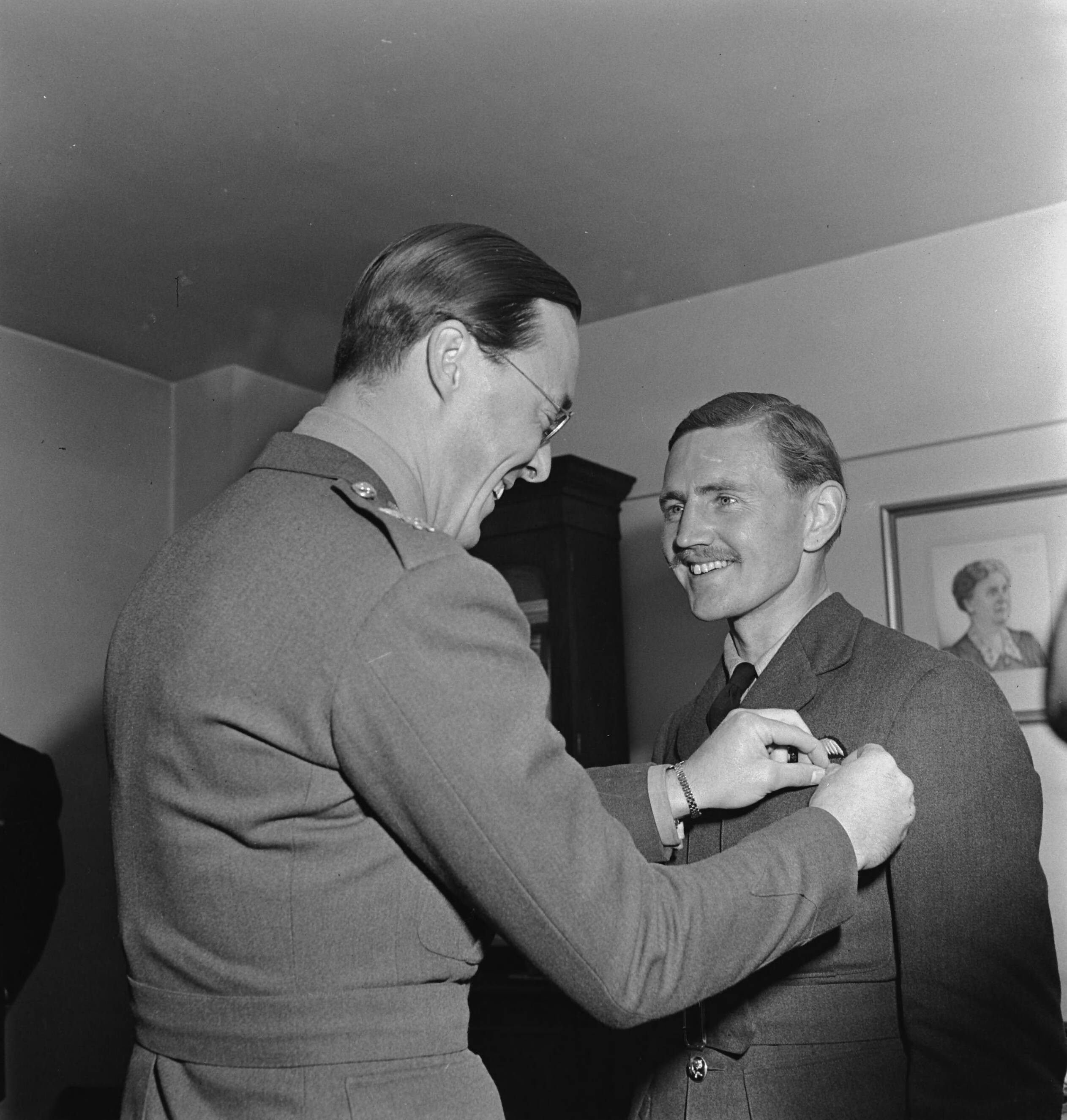 Uitreiking van het Vliegerkruis door prins Bernhard aan de Britse RAF-vlieger, Wing Commander R.N. Bateson. Bateson voerde het bevel over een formatie Mosquito-jachtbommenwerpers bij de aanval op Huize Kleykamp in Den Haag in april 1944.