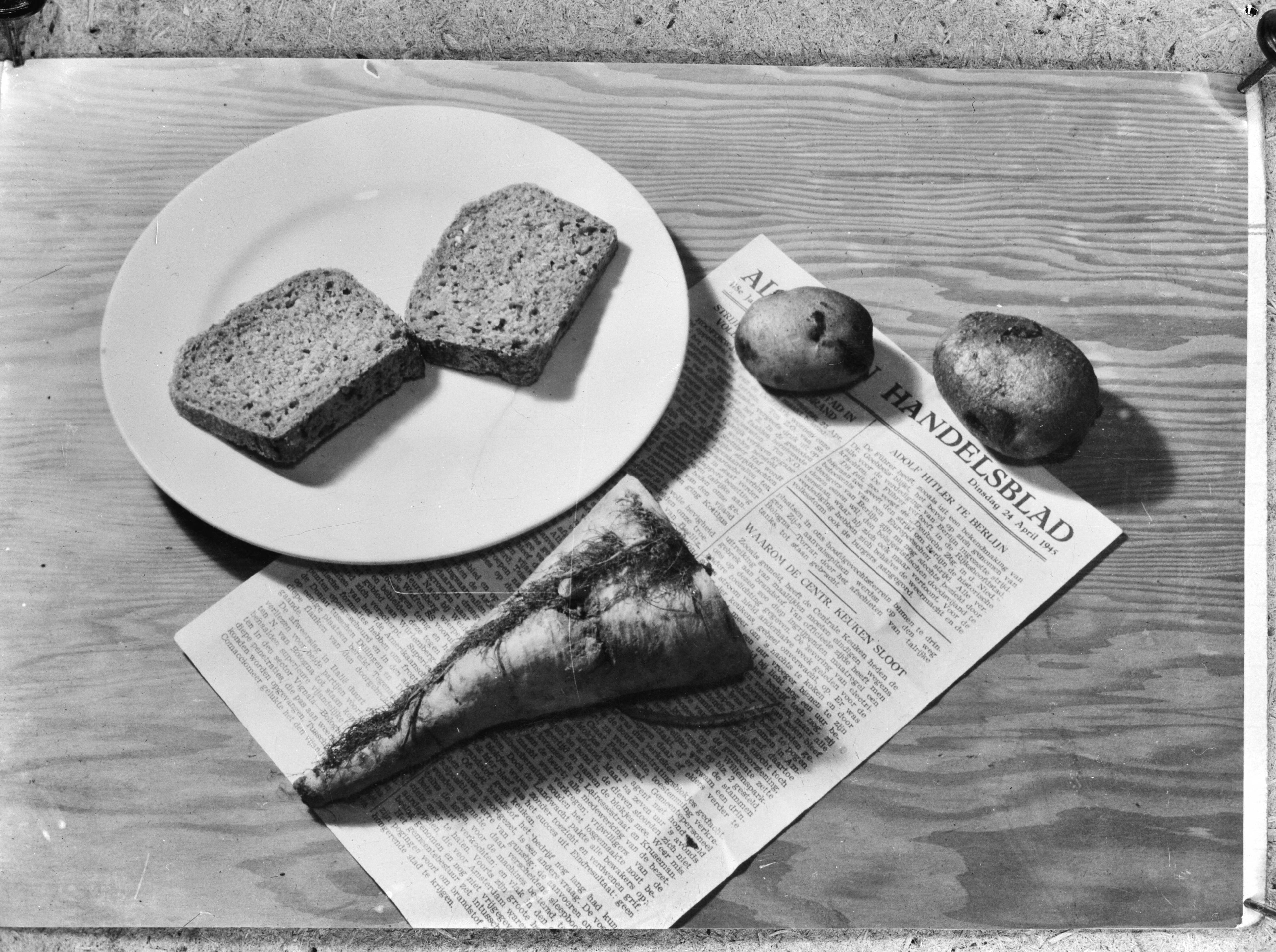 Stilleven. Bord met boterhammen, aardappels, halve koolraap?, krant Algemeen Handelsblad van 24 april 1945 met zichtbaar artikel "Waarom de Centr. Keuken sloot".