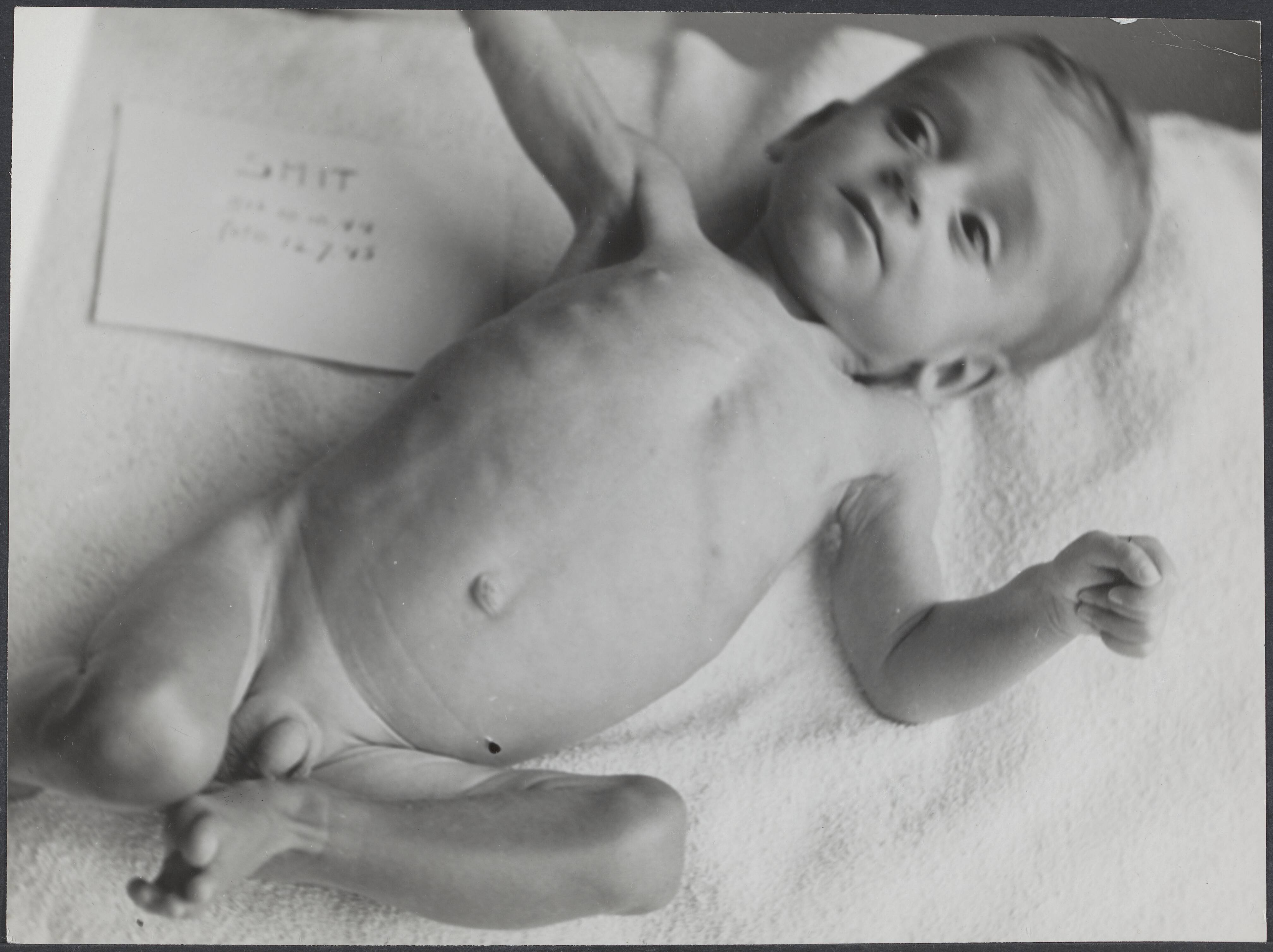 Hongerwinter. Kind lijdend aan ondervoeding geboren 10-10-1944. Op naamkaartje: Smit