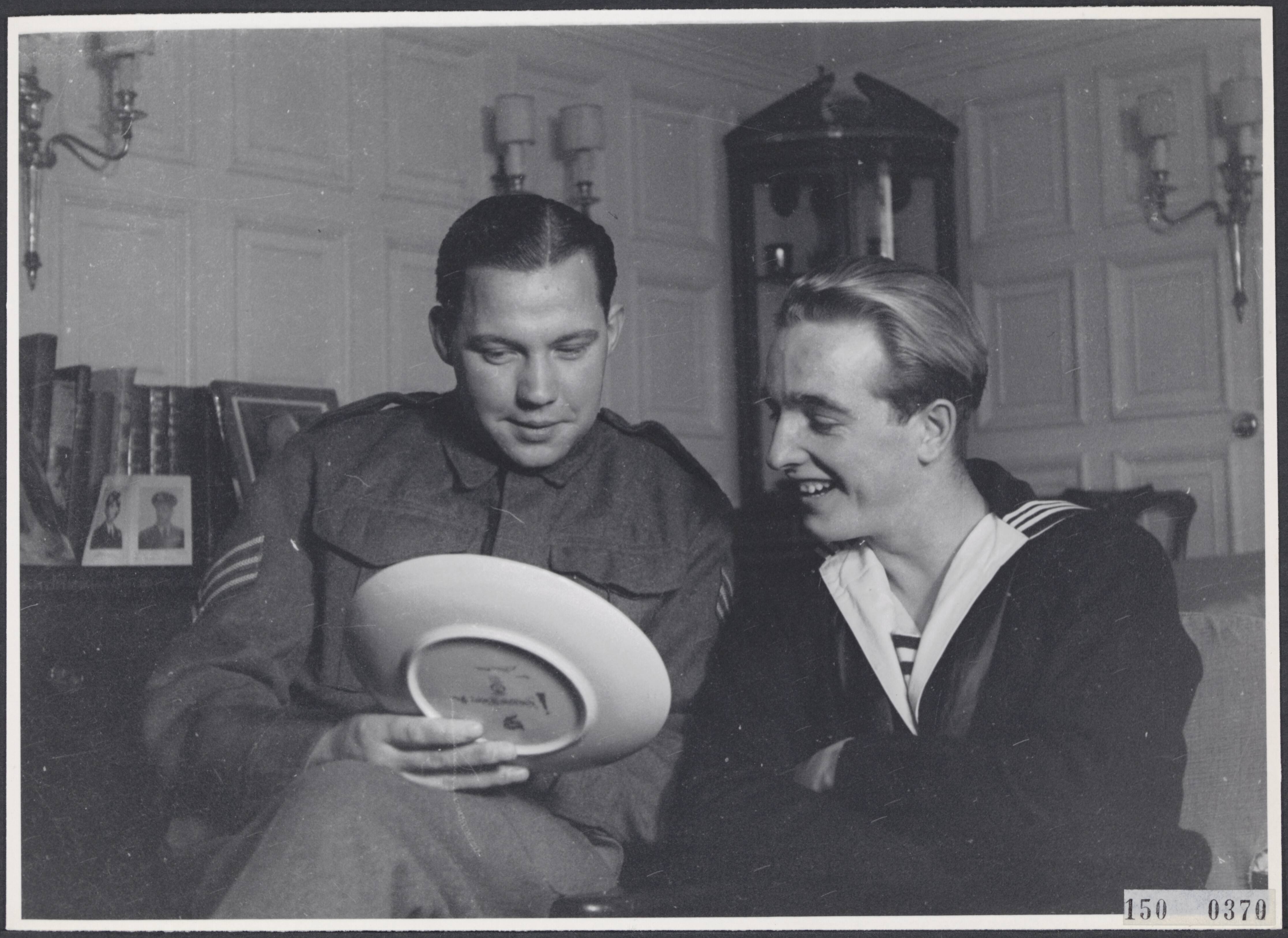 Ontvangst door koningin Wilhelmina voor enkele Nederlanders (Engelandvaarders) in haar buitenhuis, Stubbings House in Maidenhead Berkshire