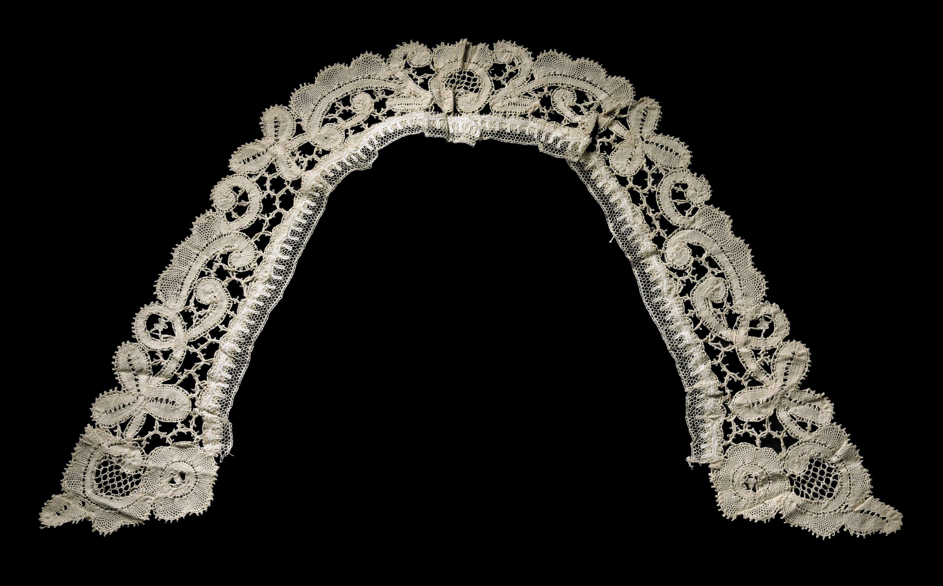 Kraagje van koningin Wilhelmina uit de nalatenschap van de kunstenaar Cor Visser. Dit kraagje draagt zij op een door Visser getekend portret. Kanten kraagje, gebogen vorm, met gazen randje, beigekleurig, iets breder aan de uiteinden.