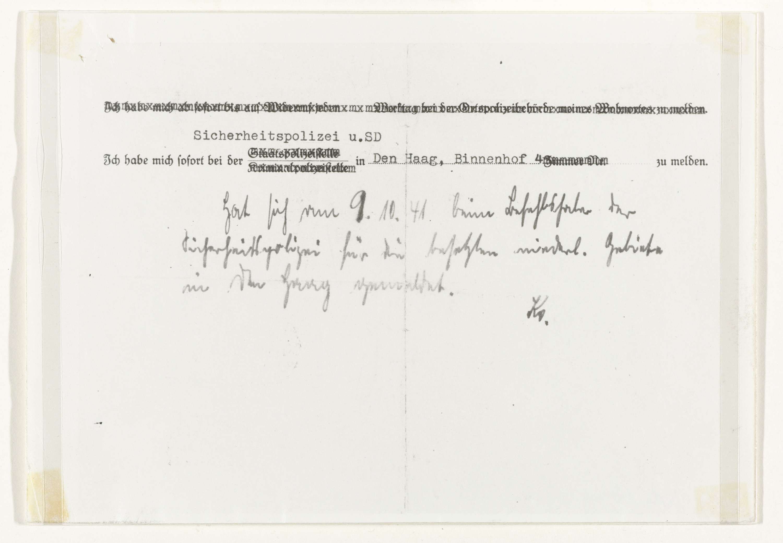 Fotokopie van de achterzijde van het ontslagbriefje van W. Drees uit het concentratiekamp Buchenwald; het bevel zich bij de S. D. in Den Haag te melden, daaronder een handgeschreven bevestiging dat hij zich gemeld heeft.