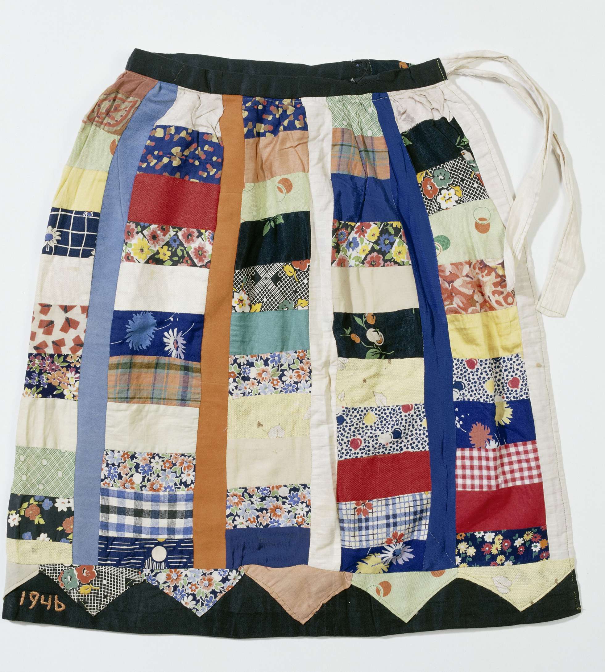Veelkleurige overslagrok met zwarte tailleband en zwarte rand aan de onderzijde. Er zit een lint door de tailleband. De rok bestaat uit rechthoekige lapjes met verticale strepen ertussen. De strepen hebben de kleuren oranje, blauw en wit. De voering is lichtrose. Langs de zoom is halverwege, in 2 blokken een tekst geborduurd, dwars door de voering: 5 / mei; 1946. Lint behorende bij feestrok: NG-1995-9-2.