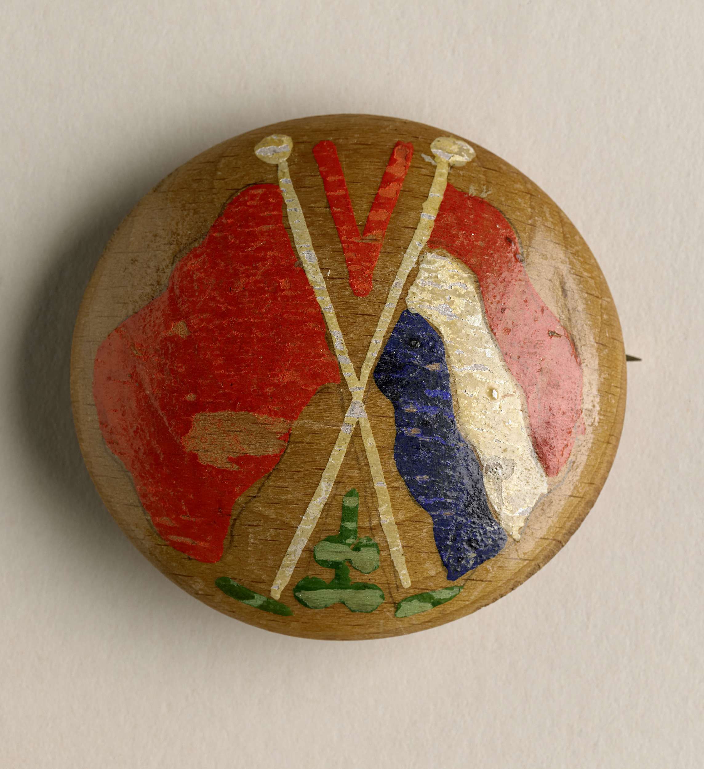 Broche gemaakt naar aanleiding van de bevrijding van Nederland op 5 mei 1945. De houten broche is beschilderd met 2 gekruiste vlaggenstokken, met links een oranje vlag en rechts de rood wit blauwe vlag.De verf van de oranje vlag is gedeeltelijk afgebladderd. Bovenaan, tussen de vlaggenstokken in, is met oranje een V geschilderd, verwijzend naar het woord vrijheid. Onderaan is met groen de suggestie gewekt van begroeing, mogelijk als symbool voor een nieuw begin. Op de achterzijde is een eenvoudige speld aangebracht en de datum 5 mei 1945 met inkt.
