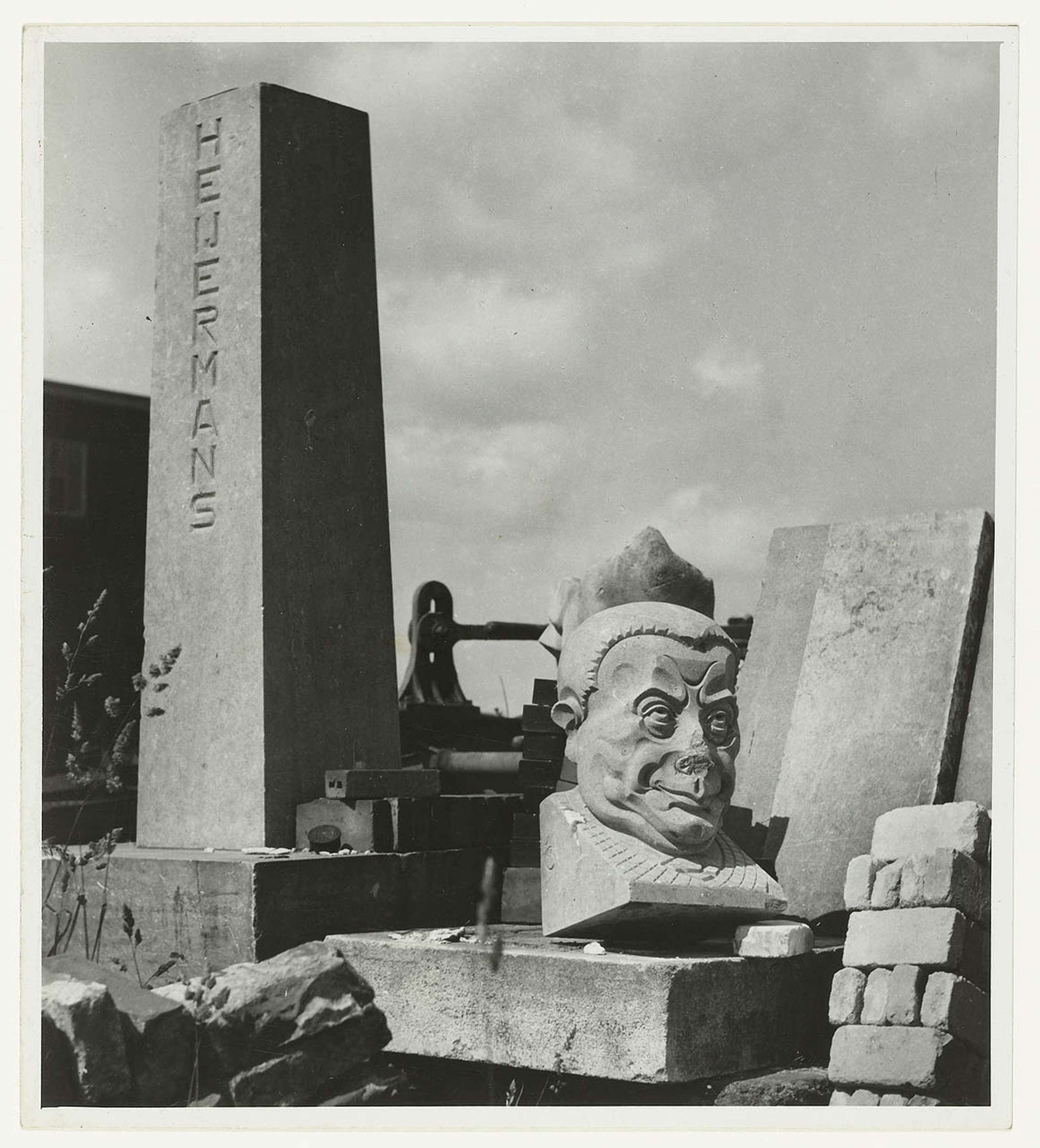 Mendes da Costa maakte van de toneelschrijver Heijermans een portretbuste die, geplaatst in het Vondelpark, op 22 november 1929 door wethouder Wibaut werd onthuld. Daarna werd het beeld dusdanig vernield dat het vervangen moest worden. De nieuwe versie van het beeld kwam in het Leidsebosje te staan. In de eerste jaren van de bezetting werd het weer zwaar beschadigd, waarop de gemeente het beeld liet opslaan. Een leerling van Mendes da Costa, Frank de Miranda kreeg de opdracht om het beeld te restaureren. Dat lukt niet en de Miranda vroeg of hij het beeld mocht houden en nam het bij zijn vertrek naar Israël (1948-1953) mee. Na zijn terugkeer deed Hildo Krop een (mislukte) poging om het beeld te herstellen. Uiteindelijk slaagde de steenhouwersfirma Van Tetterode wel in het restaureren van het beeld en op 1 juni 1964 (de 100e verjaardag van Heijermans) onthulde Krop het beeld. Wellicht is deze foto genomen op het terrein van de steenhouwerij Van Tetterode aan de Middenweg in de Watergraafsmeer.