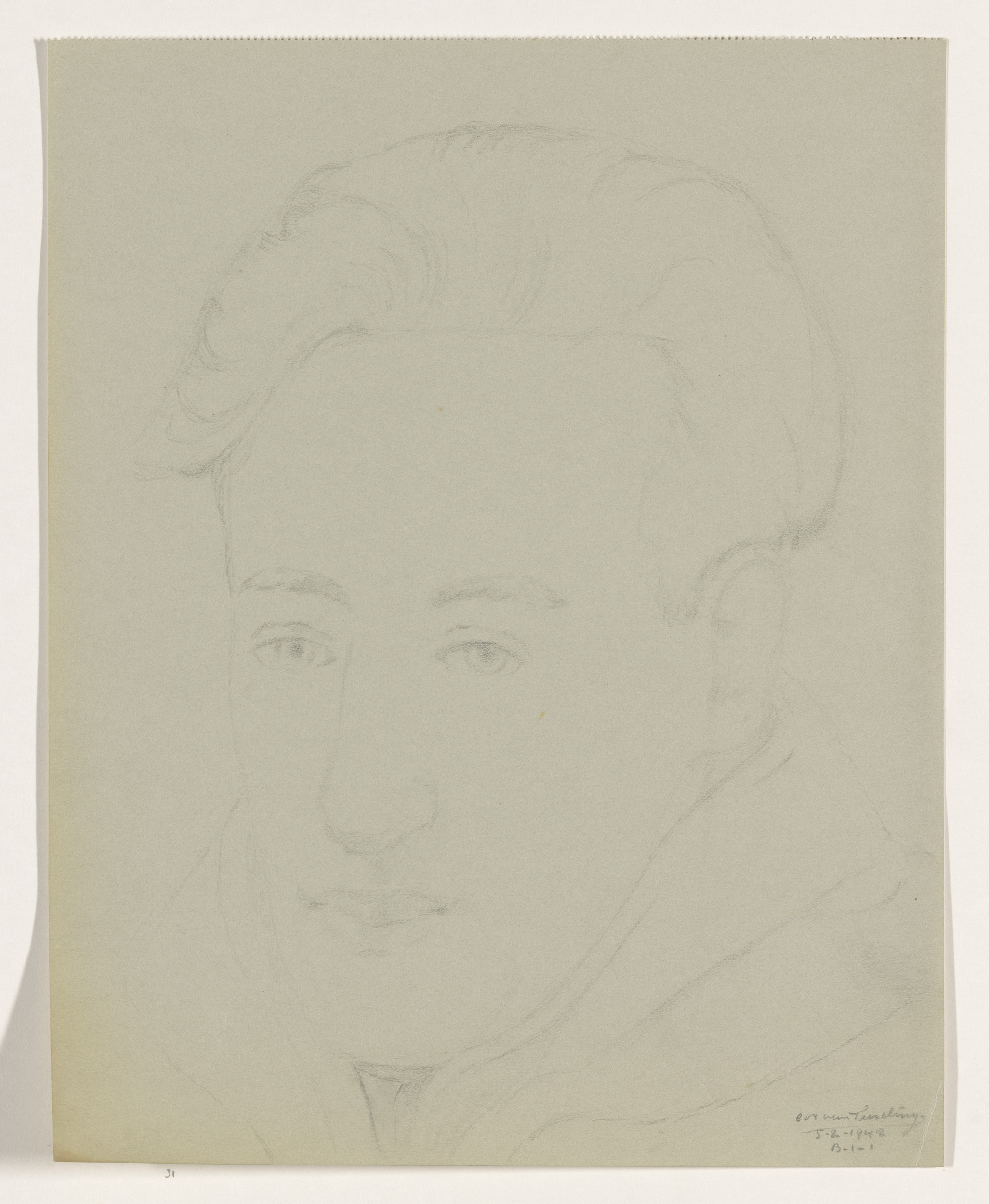Zelfportret van Cor van Teeseling met schetsblok op schoot: B-1-1, 22 februari. Getekend zelfportret van Cor van Teeseling met schetsblok. Op de achtergrond zijn tralies zichtbaar.