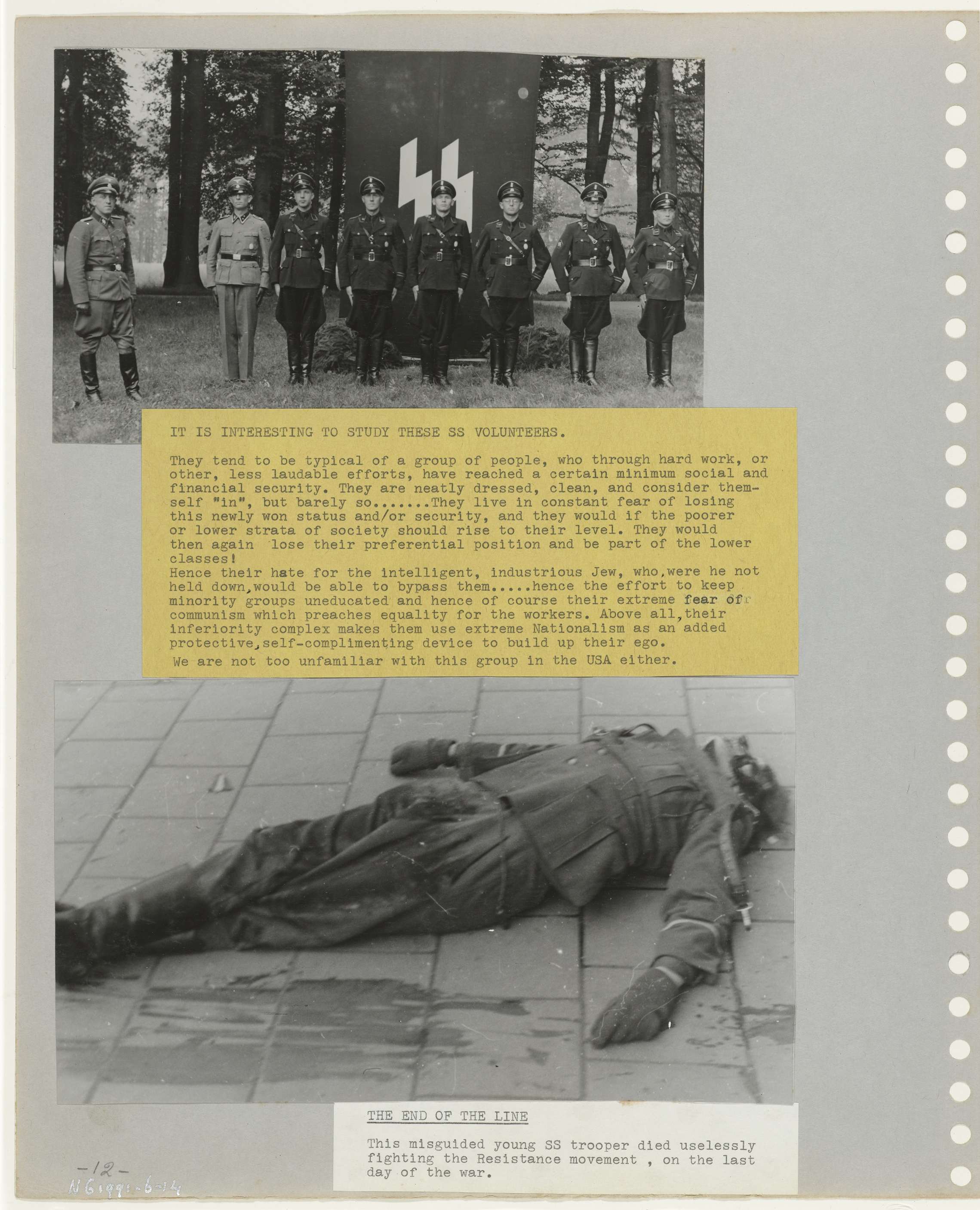 Twee foto's van de Nederlandse SS: Nederlandse SS-ers tijdens de eedaflegging ( boven). Dode Nederlandse SS-er, geliquideerd door het verzet op de laatste dag van de oorlog (onder).