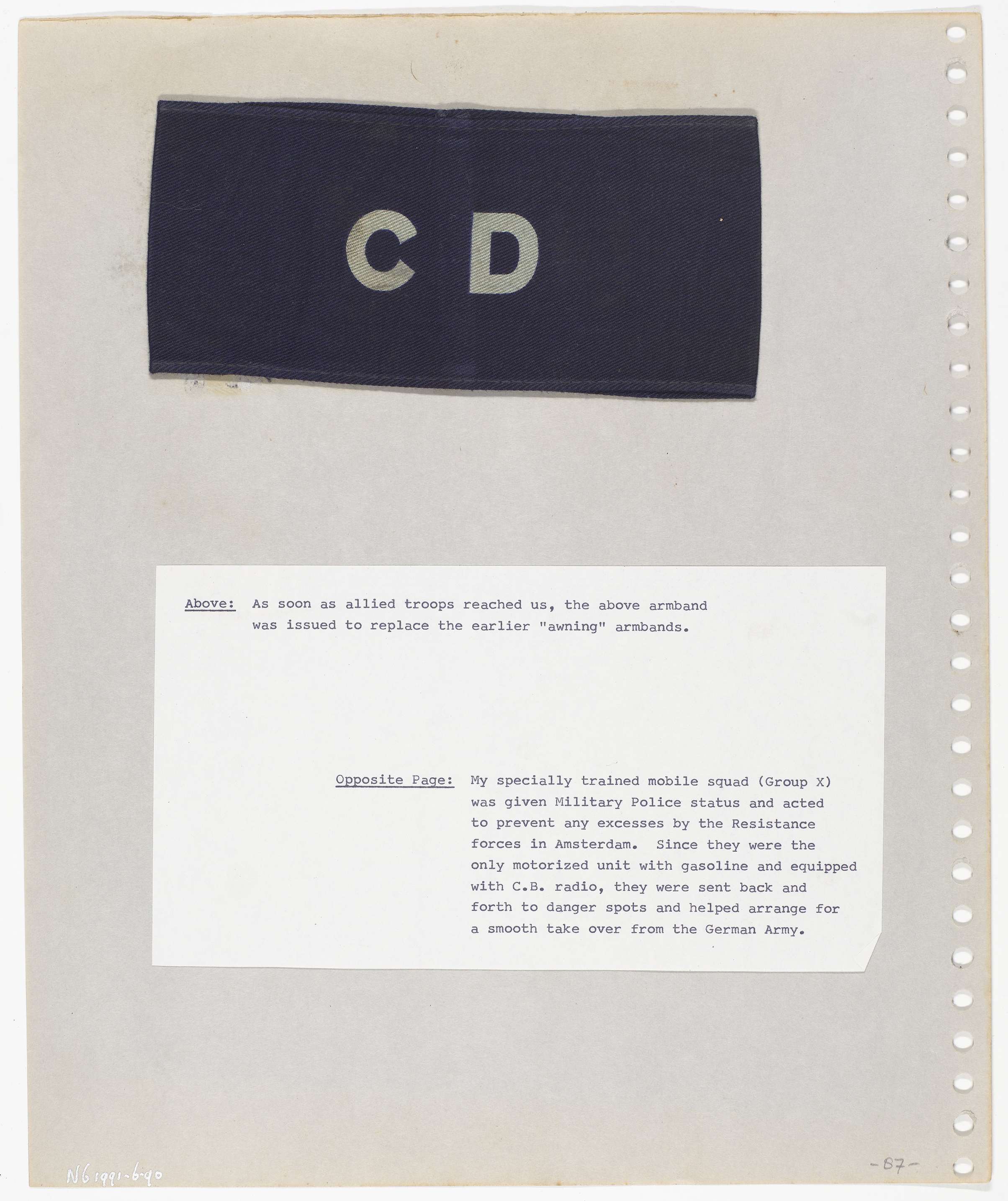 Mouwband die de band van de Nederlandse Binnenlandse Strijdkrachten - NBS - , verving uitgereikt door de geallieerde strijdkrachten, met de letters CD = Command Dutch Forces