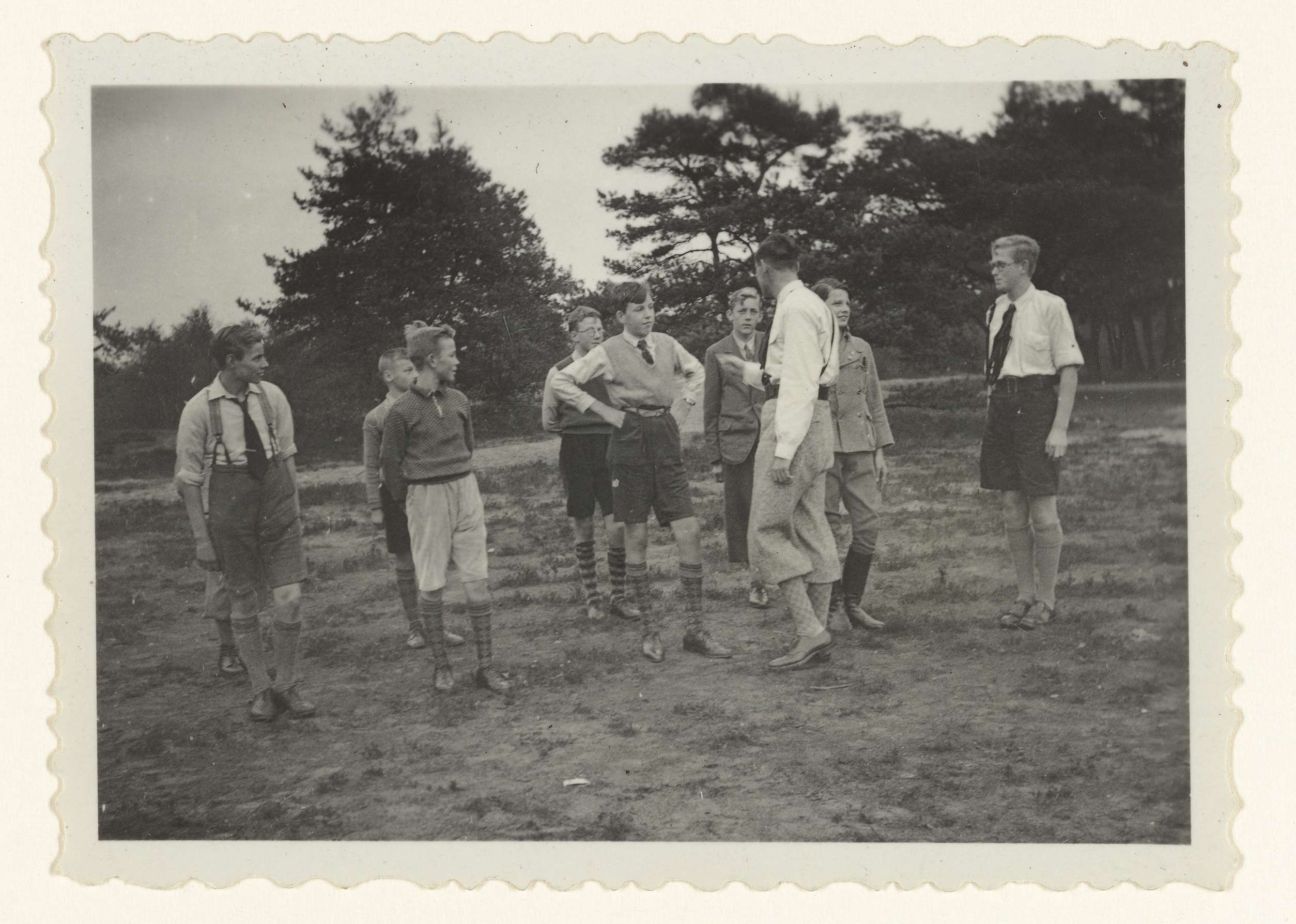Jongens van de Jeugdstorm luisteren naar Van Geelkerken, (in plusfour) leider van de Jeugdstorm, op een jeugdkamp. De meeste jongens dragen geen uniform.