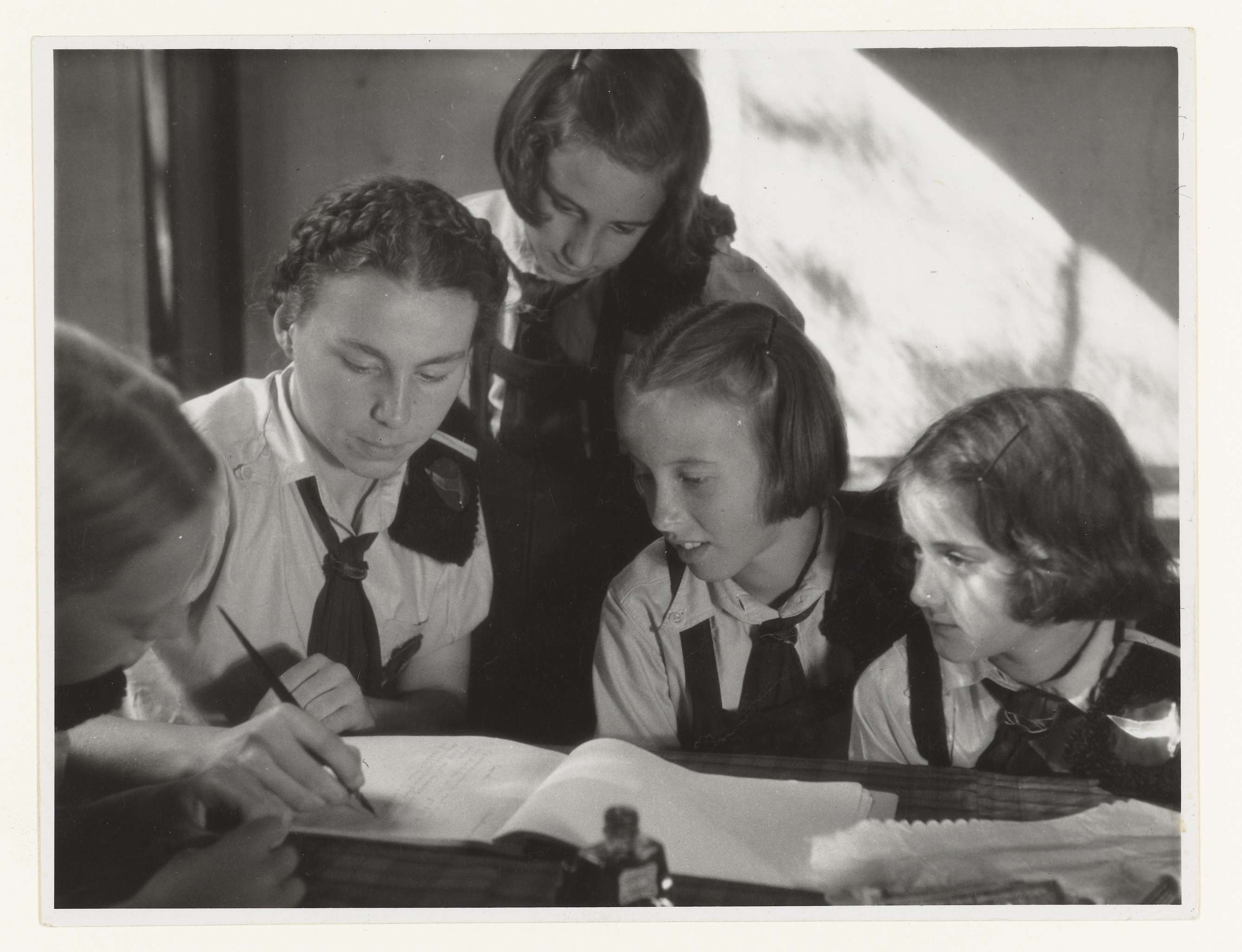 Vijf meisjes van de Jeugdstorm, in uniform, zijn bezig brieven te schrijven om naar de vrijwilligers van de Nederlandse SS aan het Oostfront te sturen. Dit gebeurde via de door Mussert in 1942 opgerichtte organisatie Frontzorg. Een meisje met vlechten om haar hoofd schrijft met pen en inkt de brief, de anderen kijken toe.