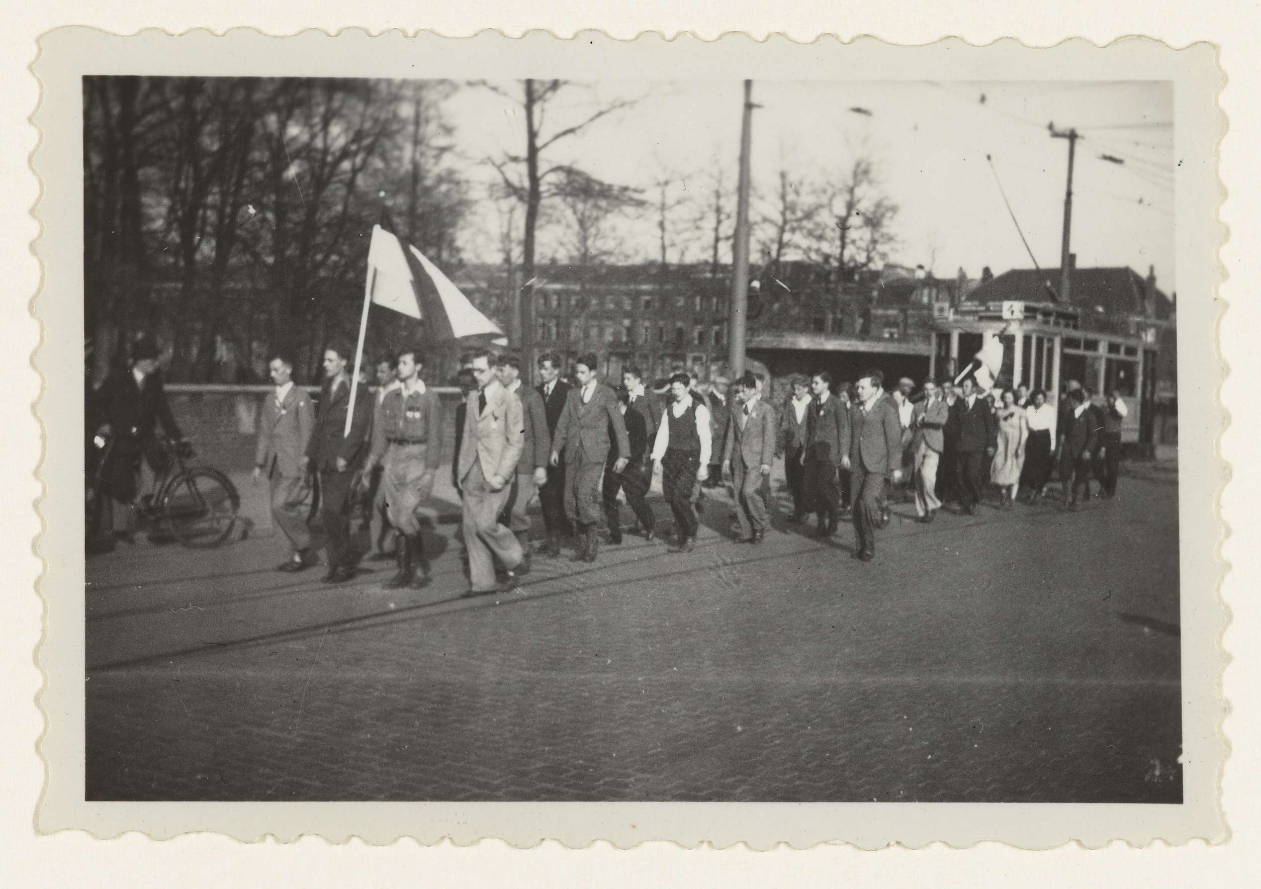 Optocht van de NSB. Voorop een man met de Nederlandse vlag. Niemand is in uniform, wel hebben sommigen hoge laarzen aan. Op de achtergrond een tram, lijn 4. Vanaf 1936 gold voor de NSB en aan hen verwante organisaties een verbod om in uniform op straat te verschijnen.