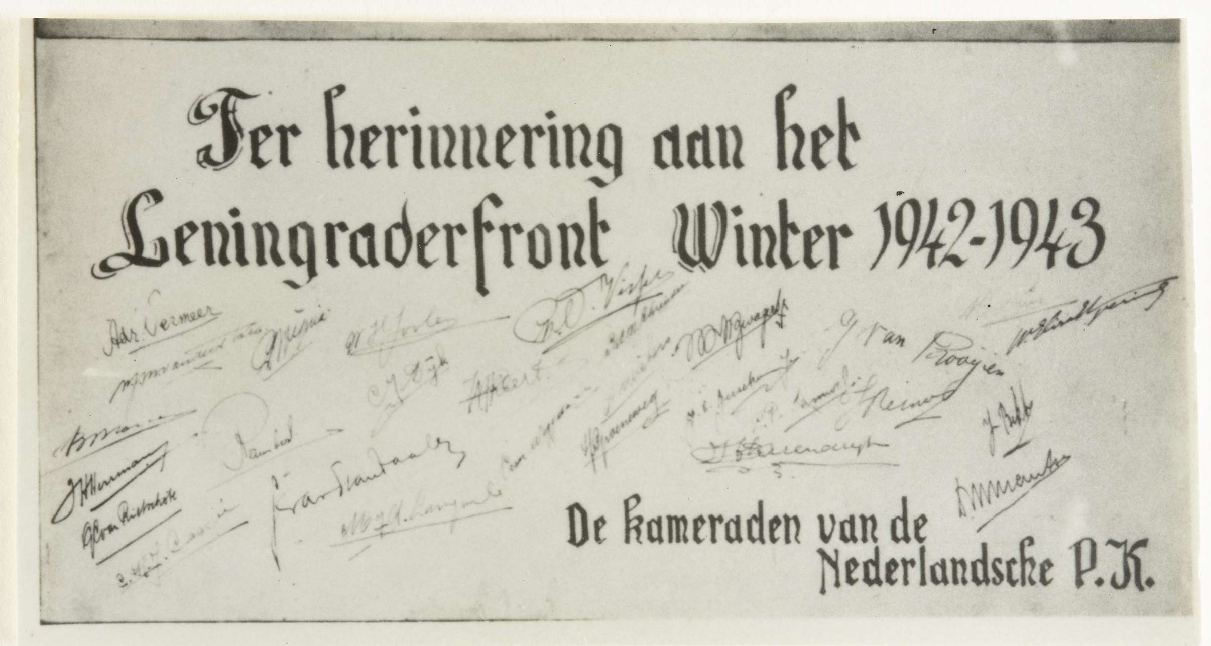 Een kaart ter herinnering aan de tijd aan het Oostfront bij Leningrad. Opschrift: "Ter herinnering aan het Leningraderfront. Winter 1942 - 1943. De kameraden van de Nederlandsche PK" (Propaganda Kompagnie). De kaart staat verder vol met handtekeningen.
