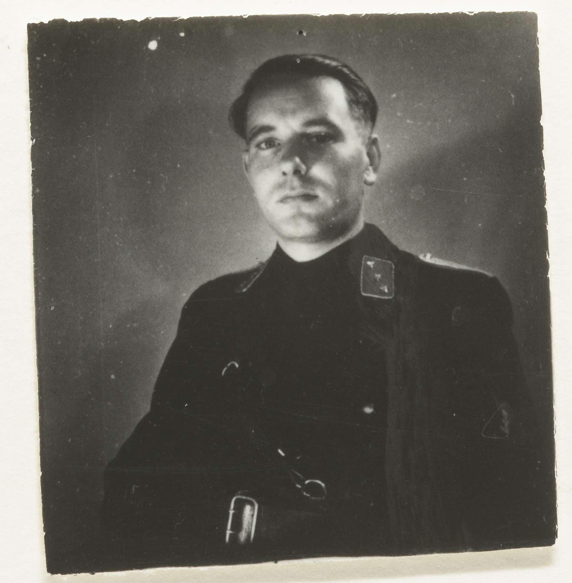 Portret van een lid van de WA. Op zijn rechtermouw het embleem van de WA met de Wolfsangel. Op zijn kraag een distinctief met drie sterren: hopman, middenkader. Blootshoofd.
