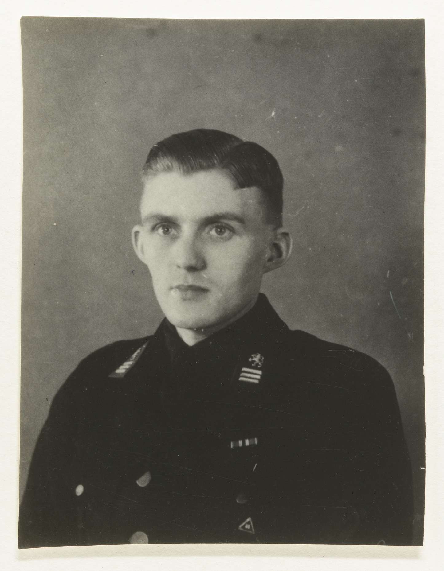 Portret van een lid van de NSB. Op zijn kraag een distinctief met een Nederlandse leeuw en drie strepen: Adjunct hoofd van Dienst (verm.), een administratieve functie. Op zijn uniformjas het NSB symbool. Blootshoofd.
