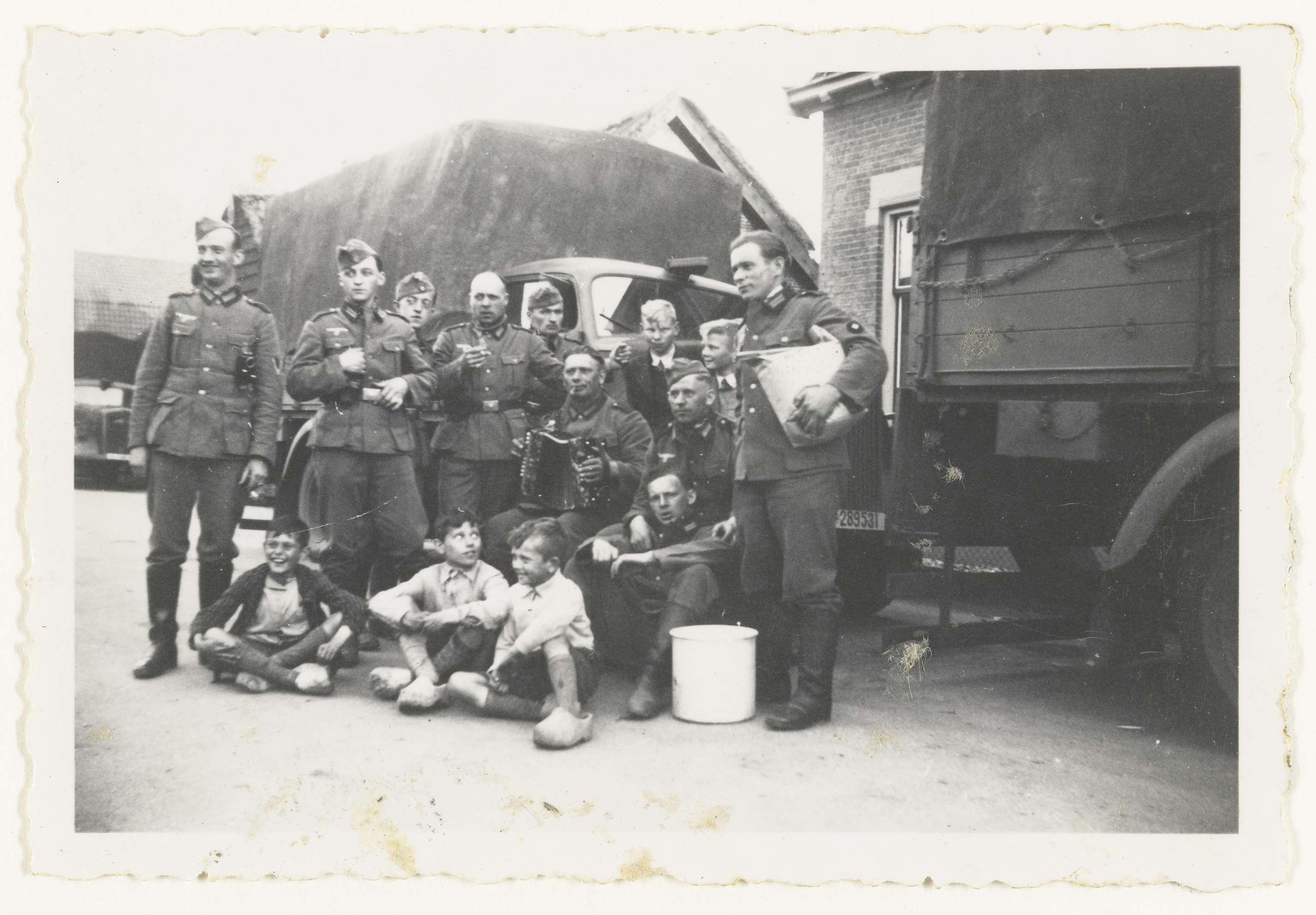 Een groep Wehrmacht militairen staan voor twee legertrucks. Een speelt op een harmonika. Voor hen zitten drie Nedelandse jongetjes met klompen aan. Achteraan staan er nog twee.