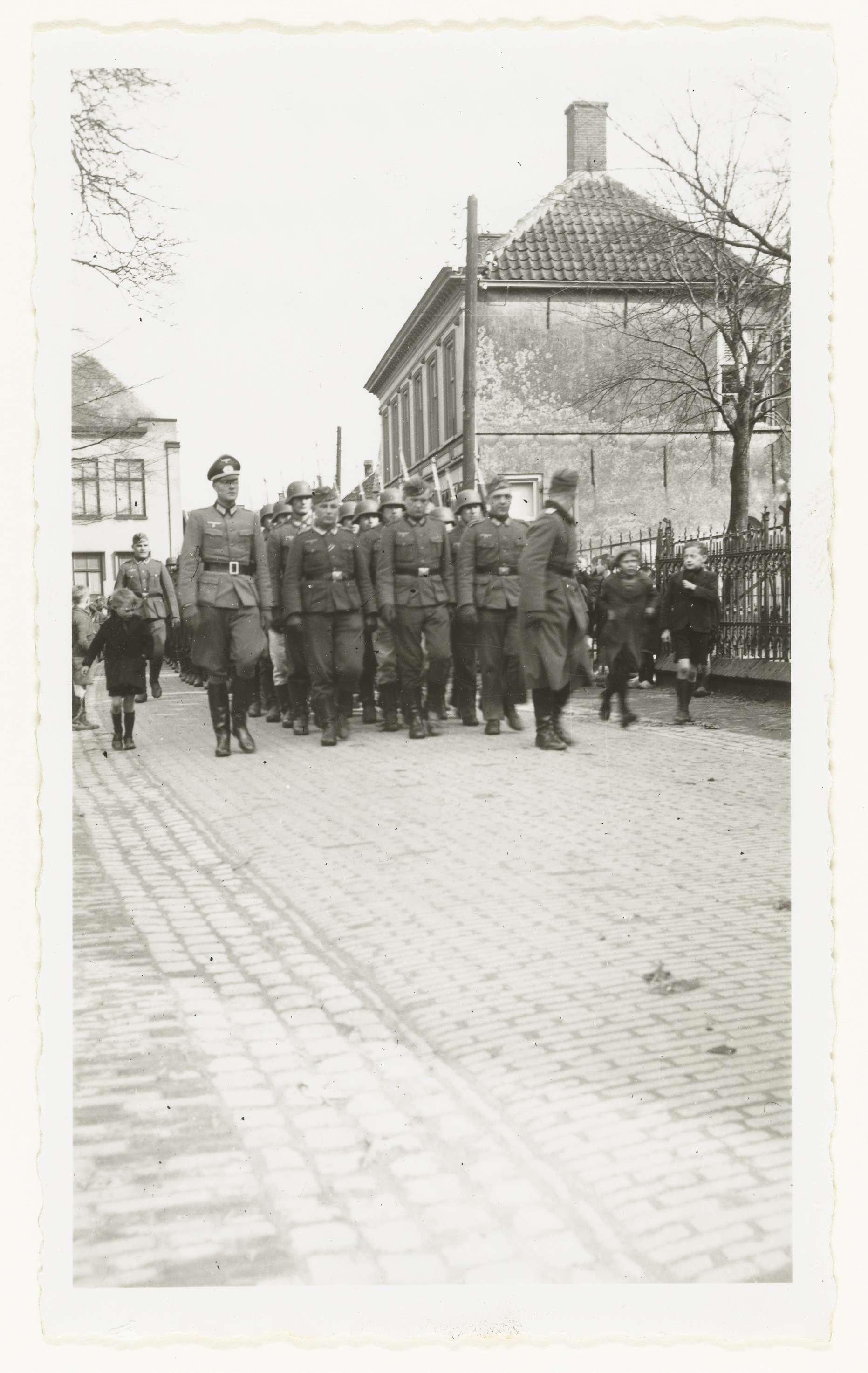 Een compagnie Duitse militairen lopen in een straat. Links en rechts lopen kinderen mee. Achterop staat: In Holland. Die Komp. kommt von Exerzierplatz zurück.