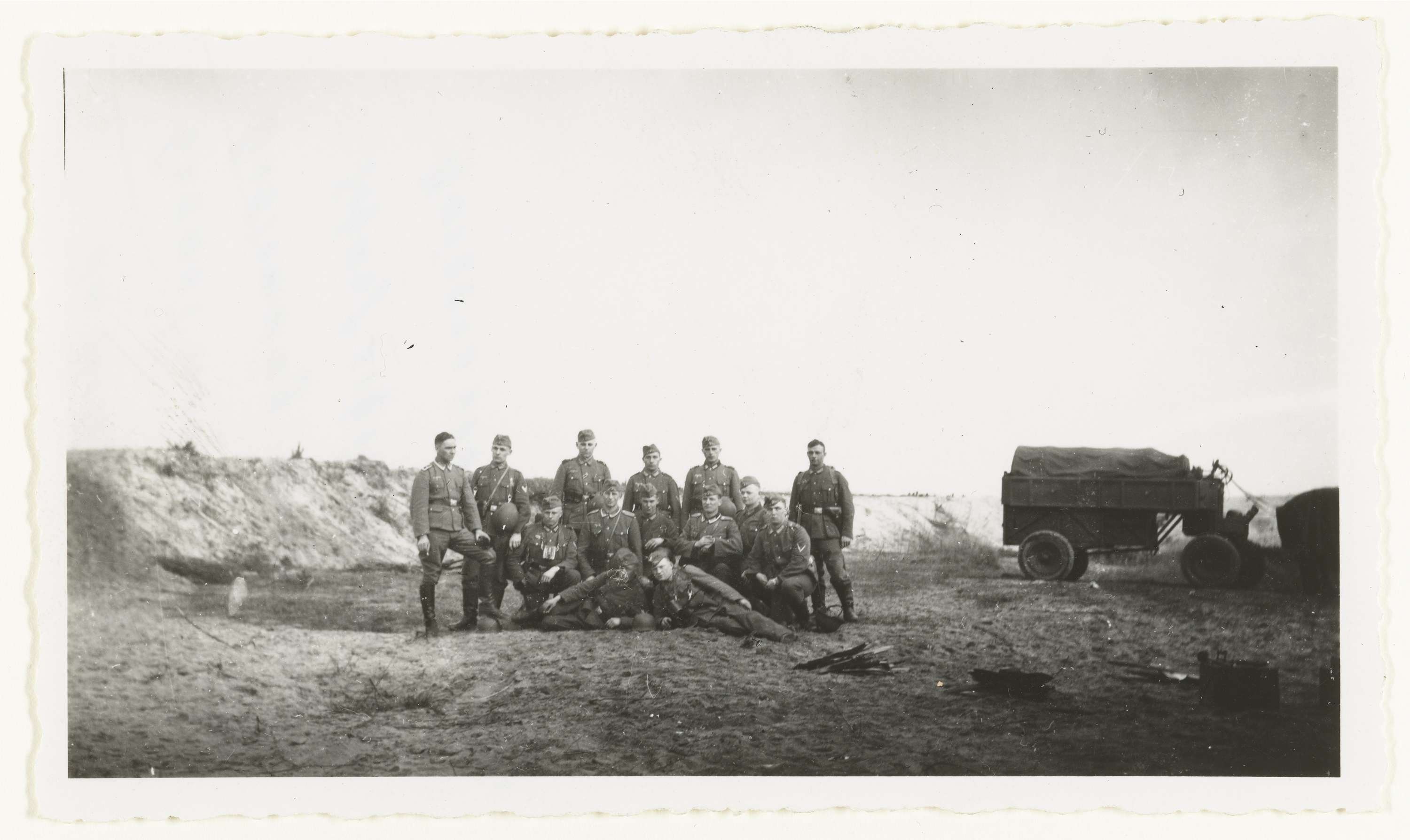 Een groep Duitse militairen poseren tijdens een oefening granaatschieten aan de oever van de Maas. Rechts van hen staat een voertuig. Achterop staat: In Holland, 41. Granatwerfen-bedienung nach dem Scharfschiessein. Kaisersveer an der Maas.