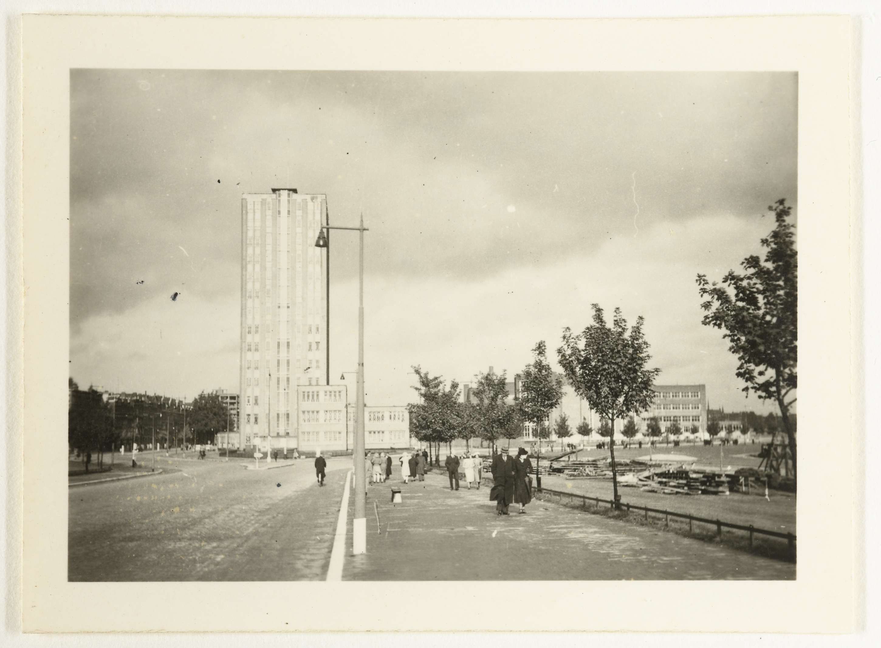Gezicht op het GEB-gebouw aan de Rochussenstraat te Rotterdam. Er is weinig te zien van het bombardement. Op achterzijde staat: Rotterdam im Sept. 1940