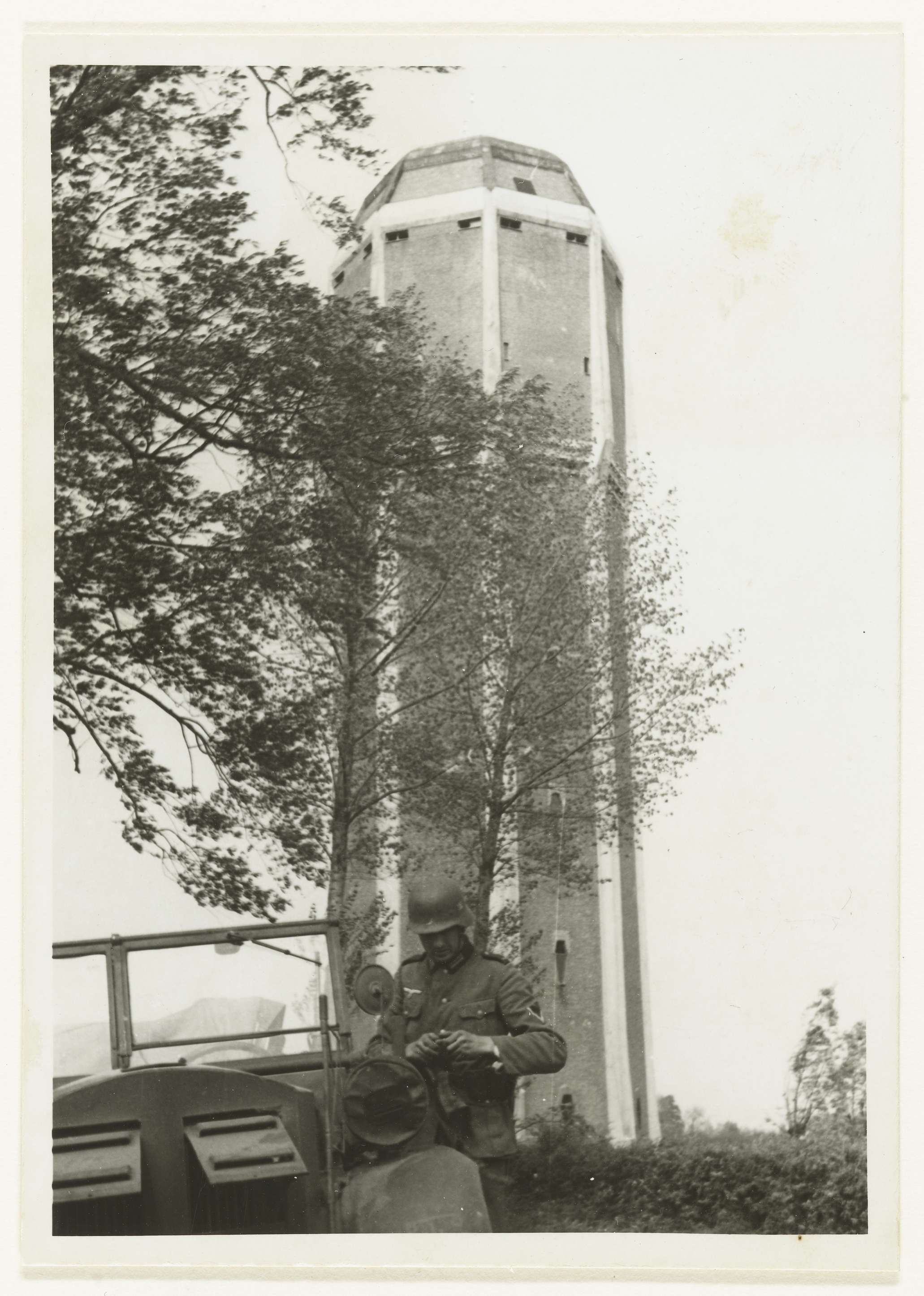 Een Wehrmacht militair staat bij een auto, achter hem bevindt zich een watertoren. Deze moet dienen als uitkijkpost. Achterop staat: Auf d. Wasserturm von Dongen.